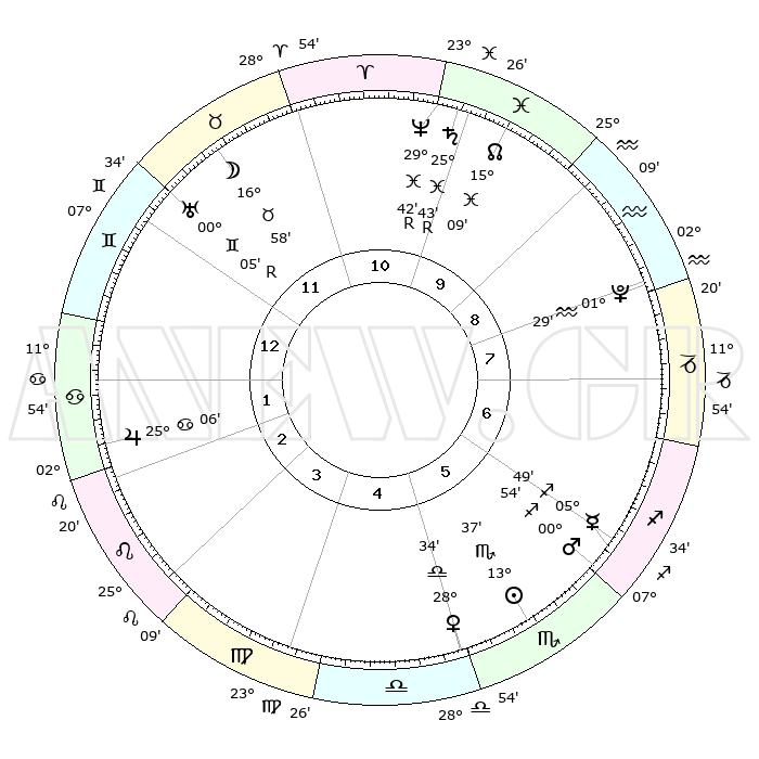 | | ΘΕΣΕΙΣ ΠΛΑΝΗΤΩΝ ΑΣΤΡΟΛΟΓΙΚΟΥ ΧΑΡΤΗ ΤΗΣ ΣΤΙΓΜΗΣ ΑΥΤΗΣ | | | | Πλανήτης | Ζώδιο | Μοίρες | Δεκαήμ. | Σε οίκο | Απόκλιση | | Ακμές των οίκων | | Ηλιος | Σκορπιός | 13°32' | Δεύτερο | 6 | 15 S 54 | | 1ος | 12°13' | Δίδυμοι | | Σελήνη | Ταύρος | 15°38' | Δεύτερο | 12 | 20 N 40 | | 2ος | 04°53' | Καρκίνος | | Ερμής | Τοξότης | 05°46' | Πρώτο | 6 | 24 S 00 | | 3ος | 26°05' | Καρκίνος | | Αφροδίτη | Ζυγός | 28°28' | Τρίτο | 5 | 09 S 37 | | 4ος | 19°58' | Λέων | | Αρης | Τοξότης | 00°51' | Πρώτο | 6 | 20 S 45 | | 5ος | 20°41' | Παρθένος | | Δίας | Καρκίνος | 25°06' | Τρίτο | 2 | 21 N 12 | | 6ος | 00°36' | Σκορπιός | | Κρόνος | Ιχθείς | 25°44'R | Τρίτο | 11 | 03 S 57 | | 7ος | 12°13' | Τοξότης | | Ουρανός | Δίδυμοι | 00°05'R | Πρώτο | 12 | 19 N 58 | | 8ος | 04°53' | Αιγόκερως | | Ποσειδώνας | Ιχθείς | 29°42'R | Τρίτο | 11 | 01 S 22 | | 9ος | 26°05' | Αιγόκερως | | Πλούτωνας | Υδροχόος | 01°29' | Πρώτο | 9 | 23 S 30 | | 10ος | 19°59' | Υδροχόος | | Β. Δεσμός | Ιχθείς | 15°09' | Δεύτερο | 10 | 05 S 51 | | 11ος | 20°41' | Ιχθείς | | Ωροσκόπος | Δίδυμοι | 12°13' | Δεύτερο | | | 12ος | 00°36' | Ταύρος | | Μεσουράνημα | Υδροχόος | 19°59' | Δεύτερο | | | |