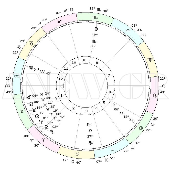 | | ΘΕΣΕΙΣ ΠΛΑΝΗΤΩΝ ΑΣΤΡΟΛΟΓΙΚΟΥ ΧΑΡΤΗ ΤΗΣ ΣΤΙΓΜΗΣ ΑΥΤΗΣ | | | | Πλανήτης | Ζώδιο | Μοίρες | Δεκαήμ. | Σε οίκο | Απόκλιση | | Ακμές των οίκων | | Ηλιος | Ιχθείς | 17°31' | Δεύτερο | 2 | 04 S 56 | | 1ος | 22°31' | Αιγόκερως | | Σελήνη | Σκορπιός | 11°17' | Δεύτερο | 9 | 19 S 39 | | 2ος | 05°12' | Ιχθείς | | Ερμής | Ιχθείς | 16°15'R | Δεύτερο | 2 | 02 S 07 | | 3ος | 14°40' | Κριός | | Αφροδίτη | Κριός | 02°03' | Πρώτο | 2 | 00 S 18 | | 4ος | 14°29' | Ταύρος | | Αρης | Ιχθείς | 04°20' | Πρώτο | 1 | 10 S 56 | | 5ος | 07°52' | Δίδυμοι | | Δίας | Καρκίνος | 15°06'R | Δεύτερο | 6 | 22 N 56 | | 6ος | 29°06' | Δίδυμοι | | Κρόνος | Κριός | 02°42' | Πρώτο | 2 | 00 S 53 | | 7ος | 22°31' | Καρκίνος | | Ουρανός | Ταύρος | 27°54' | Τρίτο | 4 | 19 N 31 | | 8ος | 05°12' | Παρθένος | | Ποσειδώνας | Κριός | 01°18' | Πρώτο | 2 | 00 S 41 | | 9ος | 14°40' | Ζυγός | | Πλούτωνας | Υδροχόος | 04°43' | Πρώτο | 1 | 22 S 51 | | 10ος | 14°28' | Σκορπιός | | Β. Δεσμός | Ιχθείς | 08°40' | Πρώτο | 2 | 08 S 19 | | 11ος | 07°52' | Τοξότης | | Ωροσκόπος | Αιγόκερως | 22°31' | Τρίτο | | | 12ος | 29°06' | Τοξότης | | Μεσουράνημα | Σκορπιός | 14°28' | Δεύτερο | | | |