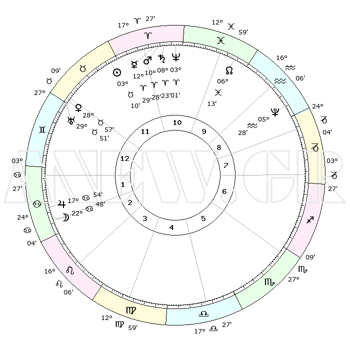| | ΘΕΣΕΙΣ ΠΛΑΝΗΤΩΝ ΑΣΤΡΟΛΟΓΙΚΟΥ ΧΑΡΤΗ ΤΗΣ ΣΤΙΓΜΗΣ ΑΥΤΗΣ | | | | Πλανήτης | Ζώδιο | Μοίρες | Δεκαήμ. | Σε οίκο | Απόκλιση | | Ακμές των οίκων | | Ηλιος | Ταύρος | 03°06' | Πρώτο | 12 | 12 N 33 | | 1ος | 12°37' | Δίδυμοι | | Σελήνη | Καρκίνος | 21°58' | Τρίτο | 2 | 25 N 14 | | 2ος | 05°13' | Καρκίνος | | Ερμής | Κριός | 12°23' | Δεύτερο | 11 | 02 N 34 | | 3ος | 26°25' | Καρκίνος | | Αφροδίτη | Ταύρος | 28°53' | Τρίτο | 12 | 20 N 26 | | 4ος | 20°21' | Λέων | | Αρης | Κριός | 10°25' | Δεύτερο | 11 | 03 N 16 | | 5ος | 21°08' | Παρθένος | | Δίας | Καρκίνος | 17°54' | Δεύτερο | 2 | 22 N 37 | | 6ος | 01°05' | Σκορπιός | | Κρόνος | Κριός | 08°22' | Πρώτο | 11 | 01 N 20 | | 7ος | 12°37' | Τοξότης | | Ουρανός | Ταύρος | 29°51' | Τρίτο | 12 | 19 N 57 | | 8ος | 05°13' | Αιγόκερως | | Ποσειδώνας | Κριός | 03°01' | Πρώτο | 11 | 00 S 01 | | 9ος | 26°25' | Αιγόκερως | | Πλούτωνας | Υδροχόος | 05°28' | Πρώτο | 9 | 22 S 48 | | 10ος | 20°21' | Υδροχόος | | Β. Δεσμός | Ιχθείς | 06°14' | Πρώτο | 10 | 09 S 14 | | 11ος | 21°08' | Ιχθείς | | Ωροσκόπος | Δίδυμοι | 12°37' | Δεύτερο | | | 12ος | 01°05' | Ταύρος | | Μεσουράνημα | Υδροχόος | 20°21' | Τρίτο | | | |
