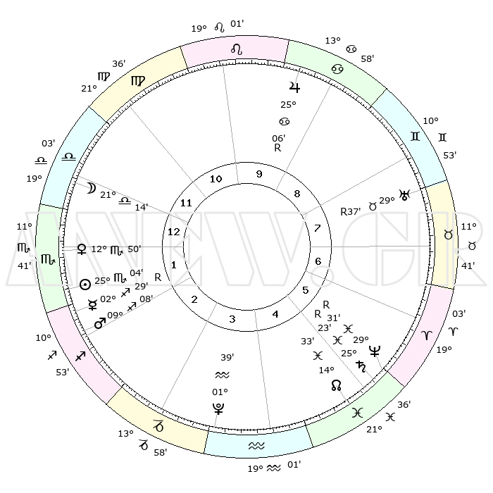 | | ΘΕΣΕΙΣ ΠΛΑΝΗΤΩΝ ΑΣΤΡΟΛΟΓΙΚΟΥ ΧΑΡΤΗ ΤΗΣ ΣΤΙΓΜΗΣ ΑΥΤΗΣ | | | | Πλανήτης | Ζώδιο | Μοίρες | Δεκαήμ. | Σε οίκο | Απόκλιση | | Ακμές των οίκων | | Ηλιος | Σκορπιός | 24°58' | Τρίτο | 2 | 19 S 00 | | 1ος | 13°20' | Ζυγός | | Σελήνη | Ζυγός | 20°04' | Τρίτο | 1 | 10 S 28 | | 2ος | 10°48' | Σκορπιός | | Ερμής | Τοξότης | 02°35'R | Πρώτο | 2 | 21 S 15 | | 3ος | 11°45' | Τοξότης | | Αφροδίτη | Σκορπιός | 12°43' | Δεύτερο | 2 | 14 S 33 | | 4ος | 15°03' | Αιγόκερως | | Αρης | Τοξότης | 09°04' | Πρώτο | 2 | 22 S 20 | | 5ος | 17°59' | Υδροχόος | | Δίας | Καρκίνος | 25°06'R | Τρίτο | 10 | 21 N 14 | | 6ος | 17°50' | Ιχθείς | | Κρόνος | Ιχθείς | 25°24'R | Τρίτο | 6 | 04 S 03 | | 7ος | 13°20' | Κριός | | Ουρανός | Ταύρος | 29°38'R | Τρίτο | 8 | 19 N 52 | | 8ος | 10°48' | Ταύρος | | Ποσειδώνας | Ιχθείς | 29°31'R | Τρίτο | 6 | 01 S 26 | | 9ος | 11°45' | Δίδυμοι | | Πλούτωνας | Υδροχόος | 01°39' | Πρώτο | 4 | 23 S 28 | | 10ος | 15°03' | Καρκίνος | | Β. Δεσμός | Ιχθείς | 14°33' | Δεύτερο | 5 | 06 S 05 | | 11ος | 17°59' | Λέων | | Ωροσκόπος | Ζυγός | 13°20' | Δεύτερο | | | 12ος | 17°50' | Παρθένος | | Μεσουράνημα | Καρκίνος | 15°03' | Δεύτερο | | | |