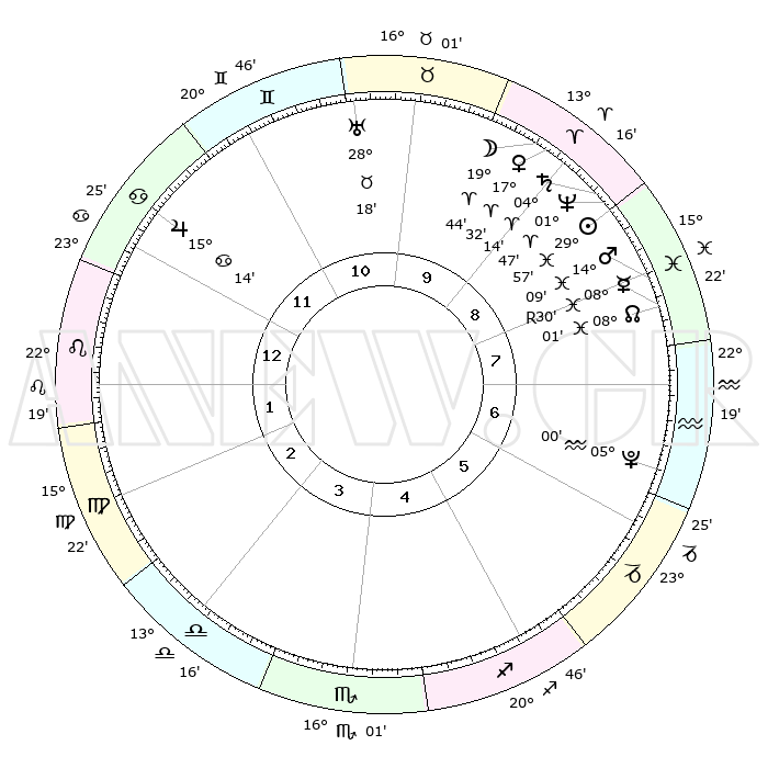 | | ΘΕΣΕΙΣ ΠΛΑΝΗΤΩΝ ΑΣΤΡΟΛΟΓΙΚΟΥ ΧΑΡΤΗ ΤΗΣ ΣΤΙΓΜΗΣ ΑΥΤΗΣ | | | | Πλανήτης | Ζώδιο | Μοίρες | Δεκαήμ. | Σε οίκο | Απόκλιση | | Ακμές των οίκων | | Ηλιος | Ιχθείς | 29°52' | Τρίτο | 9 | 00 S 03 | | 1ος | 29°33' | Καρκίνος | | Σελήνη | Κριός | 18°37' | Δεύτερο | 10 | 10 N 24 | | 2ος | 20°34' | Λέων | | Ερμής | Ιχθείς | 08°30'R | Πρώτο | 8 | 07 S 24 | | 3ος | 15°33' | Παρθένος | | Αφροδίτη | Κριός | 17°26' | Δεύτερο | 10 | 06 N 02 | | 4ος | 16°32' | Ζυγός | | Αρης | Ιχθείς | 14°06' | Δεύτερο | 8 | 07 S 15 | | 5ος | 22°35' | Σκορπιός | | Δίας | Καρκίνος | 15°14' | Δεύτερο | 12 | 22 N 55 | | 6ος | 28°22' | Τοξότης | | Κρόνος | Κριός | 04°14' | Πρώτο | 9 | 00 S 16 | | 7ος | 29°33' | Αιγόκερως | | Ουρανός | Ταύρος | 28°18' | Τρίτο | 11 | 19 N 36 | | 8ος | 20°34' | Υδροχόος | | Ποσειδώνας | Κριός | 01°46' | Πρώτο | 9 | 00 S 30 | | 9ος | 15°33' | Ιχθείς | | Πλούτωνας | Υδροχόος | 05°00' | Πρώτο | 7 | 22 S 49 | | 10ος | 16°31' | Κριός | | Β. Δεσμός | Ιχθείς | 08°01' | Πρώτο | 8 | 08 S 34 | | 11ος | 22°35' | Ταύρος | | Ωροσκόπος | Καρκίνος | 29°33' | Τρίτο | | | 12ος | 28°22' | Δίδυμοι | | Μεσουράνημα | Κριός | 16°31' | Δεύτερο | | | |