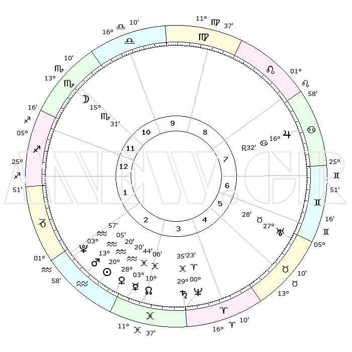 | | ΘΕΣΕΙΣ ΠΛΑΝΗΤΩΝ ΑΣΤΡΟΛΟΓΙΚΟΥ ΧΑΡΤΗ ΤΗΣ ΣΤΙΓΜΗΣ ΑΥΤΗΣ | | | | Πλανήτης | Ζώδιο | Μοίρες | Δεκαήμ. | Σε οίκο | Απόκλιση | | Ακμές των οίκων | | Ηλιος | Υδροχόος | 20°15' | Τρίτο | 3 | 14 S 44 | | 1ος | 03°08' | Τοξότης | | Σελήνη | Σκορπιός | 14°38' | Δεύτερο | 12 | 20 S 47 | | 2ος | 04°43' | Αιγόκερως | | Ερμής | Ιχθείς | 03°36' | Πρώτο | 3 | 11 S 10 | | 3ος | 10°57' | Υδροχόος | | Αφροδίτη | Υδροχόος | 28°14' | Τρίτο | 3 | 13 S 26 | | 4ος | 17°02' | Ιχθείς | | Αρης | Υδροχόος | 13°01' | Δεύτερο | 3 | 17 S 56 | | 5ος | 17°40' | Κριός | | Δίας | Καρκίνος | 16°32'R | Δεύτερο | 8 | 22 N 44 | | 6ος | 12°17' | Ταύρος | | Κρόνος | Ιχθείς | 29°35' | Τρίτο | 4 | 02 S 09 | | 7ος | 03°08' | Δίδυμοι | | Ουρανός | Ταύρος | 27°28' | Τρίτο | 6 | 19 N 24 | | 8ος | 04°43' | Καρκίνος | | Ποσειδώνας | Κριός | 00°23' | Πρώτο | 4 | 01 S 03 | | 9ος | 10°57' | Λέων | | Πλούτωνας | Υδροχόος | 03°57' | Πρώτο | 2 | 22 S 59 | | 10ος | 17°02' | Παρθένος | | Β. Δεσμός | Ιχθείς | 10°06' | Δεύτερο | 3 | 07 S 47 | | 11ος | 17°40' | Ζυγός | | Ωροσκόπος | Τοξότης | 03°08' | Πρώτο | | | 12ος | 12°17' | Σκορπιός | | Μεσουράνημα | Παρθένος | 17°02' | Δεύτερο | | | |