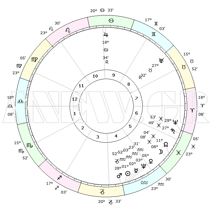 | | ΘΕΣΕΙΣ ΠΛΑΝΗΤΩΝ ΑΣΤΡΟΛΟΓΙΚΟΥ ΧΑΡΤΗ ΤΗΣ ΣΤΙΓΜΗΣ ΑΥΤΗΣ | | | | Πλανήτης | Ζώδιο | Μοίρες | Δεκαήμ. | Σε οίκο | Απόκλιση | | Ακμές των οίκων | | Ηλιος | Υδροχόος | 01°48' | Πρώτο | 5 | 19 S 45 | | 1ος | 26°52' | Παρθένος | | Σελήνη | Ιχθείς | 07°12' | Πρώτο | 6 | 09 S 03 | | 2ος | 23°13' | Ζυγός | | Ερμής | Υδροχόος | 01°56' | Πρώτο | 5 | 21 S 44 | | 3ος | 23°32' | Σκορπιός | | Αφροδίτη | Υδροχόος | 05°26' | Πρώτο | 5 | 20 S 02 | | 4ος | 26°29' | Τοξότης | | Αρης | Αιγόκερως | 28°48' | Τρίτο | 4 | 21 S 23 | | 5ος | 29°30' | Αιγόκερως | | Δίας | Καρκίνος | 18°35'R | Δεύτερο | 10 | 22 N 26 | | 6ος | 00°03' | Ιχθείς | | Κρόνος | Ιχθείς | 27°49' | Τρίτο | 7 | 02 S 53 | | 7ος | 26°52' | Ιχθείς | | Ουρανός | Ταύρος | 27°32'R | Τρίτο | 9 | 19 N 25 | | 8ος | 23°13' | Κριός | | Ποσειδώνας | Ιχθείς | 29°53' | Τρίτο | 7 | 01 S 15 | | 9ος | 23°32' | Ταύρος | | Πλούτωνας | Υδροχόος | 03°23' | Πρώτο | 5 | 23 S 05 | | 10ος | 26°29' | Δίδυμοι | | Β. Δεσμός | Ιχθείς | 11°04' | Δεύτερο | 6 | 07 S 25 | | 11ος | 29°30' | Καρκίνος | | Ωροσκόπος | Παρθένος | 26°52' | Τρίτο | | | 12ος | 00°03' | Παρθένος | | Μεσουράνημα | Δίδυμοι | 26°29' | Τρίτο | | | |
