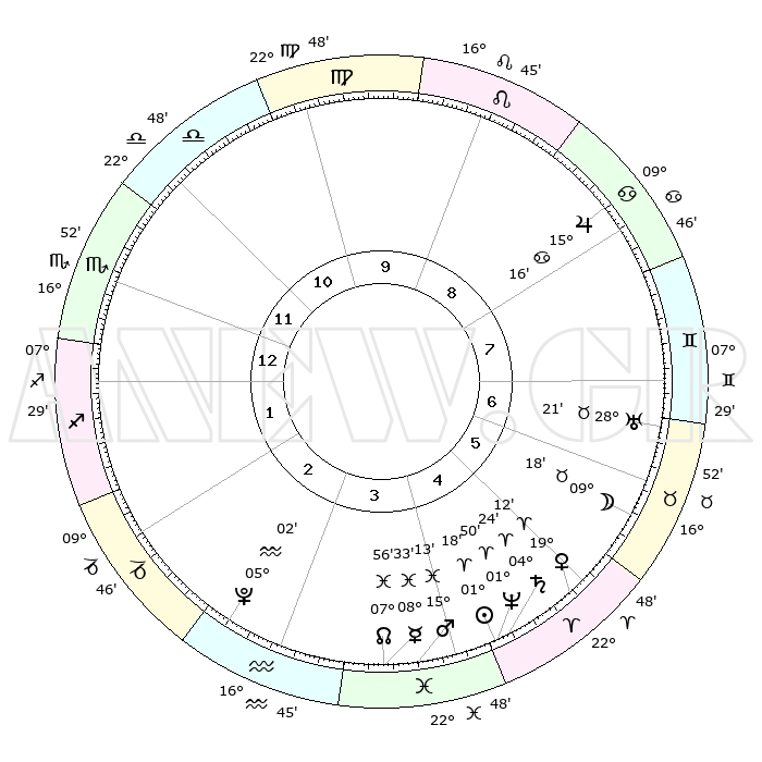 | | ΘΕΣΕΙΣ ΠΛΑΝΗΤΩΝ ΑΣΤΡΟΛΟΓΙΚΟΥ ΧΑΡΤΗ ΤΗΣ ΣΤΙΓΜΗΣ ΑΥΤΗΣ | | | | Πλανήτης | Ζώδιο | Μοίρες | Δεκαήμ. | Σε οίκο | Απόκλιση | | Ακμές των οίκων | | Ηλιος | Κριός | 01°14' | Πρώτο | 5 | 00 N 29 | | 1ος | 16°36' | Σκορπιός | | Σελήνη | Ταύρος | 08°16' | Πρώτο | 6 | 18 N 31 | | 2ος | 16°13' | Τοξότης | | Ερμής | Ιχθείς | 08°33' | Πρώτο | 4 | 07 S 41 | | 3ος | 19°55' | Αιγόκερως | | Αφροδίτη | Κριός | 19°07' | Δεύτερο | 5 | 06 N 43 | | 4ος | 25°18' | Υδροχόος | | Αρης | Ιχθείς | 15°10' | Δεύτερο | 4 | 06 S 50 | | 5ος | 27°37' | Ιχθείς | | Δίας | Καρκίνος | 15°16' | Δεύτερο | 8 | 22 N 55 | | 6ος | 24°27' | Κριός | | Κρόνος | Κριός | 04°24' | Πρώτο | 5 | 00 S 12 | | 7ος | 16°36' | Ταύρος | | Ουρανός | Ταύρος | 28°21' | Τρίτο | 7 | 19 N 37 | | 8ος | 16°13' | Δίδυμοι | | Ποσειδώνας | Κριός | 01°50' | Πρώτο | 5 | 00 S 28 | | 9ος | 19°55' | Καρκίνος | | Πλούτωνας | Υδροχόος | 05°02' | Πρώτο | 3 | 22 S 48 | | 10ος | 25°18' | Λέων | | Β. Δεσμός | Ιχθείς | 07°56' | Πρώτο | 4 | 08 S 35 | | 11ος | 27°37' | Παρθένος | | Ωροσκόπος | Σκορπιός | 16°36' | Δεύτερο | | | 12ος | 24°27' | Ζυγός | | Μεσουράνημα | Λέων | 25°18' | Τρίτο | | | |