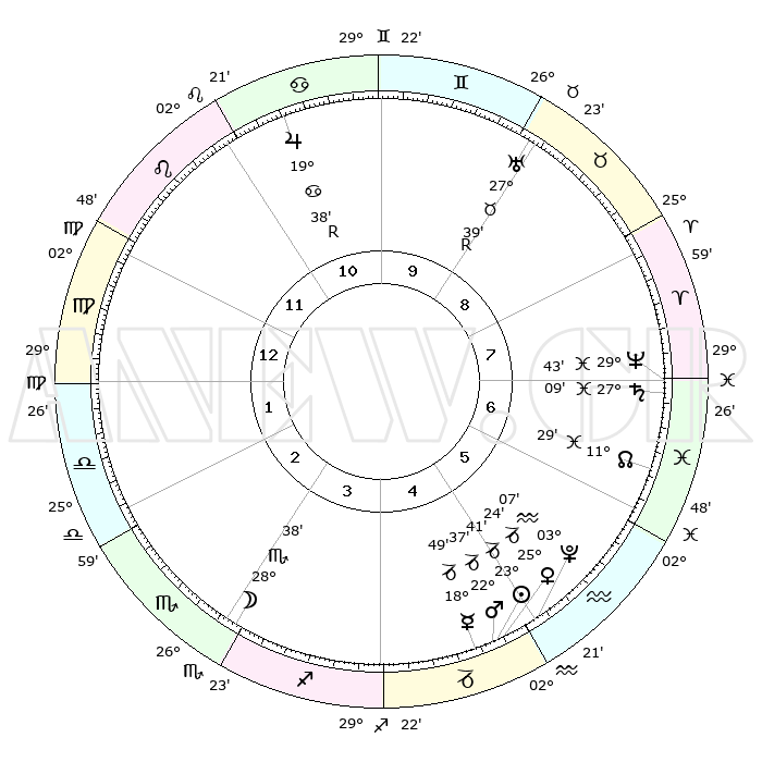 | | ΘΕΣΕΙΣ ΠΛΑΝΗΤΩΝ ΑΣΤΡΟΛΟΓΙΚΟΥ ΧΑΡΤΗ ΤΗΣ ΣΤΙΓΜΗΣ ΑΥΤΗΣ | | | | Πλανήτης | Ζώδιο | Μοίρες | Δεκαήμ. | Σε οίκο | Απόκλιση | | Ακμές των οίκων | | Ηλιος | Αιγόκερως | 23°36' | Τρίτο | 5 | 21 S 22 | | 1ος | 06°22' | Παρθένος | | Σελήνη | Σκορπιός | 27°43' | Τρίτο | 3 | 24 S 31 | | 2ος | 00°52' | Ζυγός | | Ερμής | Αιγόκερως | 18°41' | Δεύτερο | 5 | 23 S 49 | | 3ος | 00°04' | Σκορπιός | | Αφροδίτη | Αιγόκερως | 25°18' | Τρίτο | 5 | 22 S 00 | | 4ος | 03°01' | Τοξότης | | Αρης | Αιγόκερως | 22°33' | Τρίτο | 5 | 22 S 30 | | 5ος | 06°49' | Αιγόκερως | | Δίας | Καρκίνος | 19°38'R | Δεύτερο | 11 | 22 N 16 | | 6ος | 08°19' | Υδροχόος | | Κρόνος | Ιχθείς | 27°09' | Τρίτο | 7 | 03 S 10 | | 7ος | 06°22' | Ιχθείς | | Ουρανός | Ταύρος | 27°39'R | Τρίτο | 9 | 19 N 27 | | 8ος | 00°52' | Κριός | | Ποσειδώνας | Ιχθείς | 29°43' | Τρίτο | 7 | 01 S 20 | | 9ος | 00°04' | Ταύρος | | Πλούτωνας | Υδροχόος | 03°07' | Πρώτο | 5 | 23 S 08 | | 10ος | 03°01' | Δίδυμοι | | Β. Δεσμός | Ιχθείς | 11°30' | Δεύτερο | 7 | 07 S 15 | | 11ος | 06°49' | Καρκίνος | | Ωροσκόπος | Παρθένος | 06°22' | Πρώτο | | | 12ος | 08°19' | Λέων | | Μεσουράνημα | Δίδυμοι | 03°01' | Πρώτο | | | |