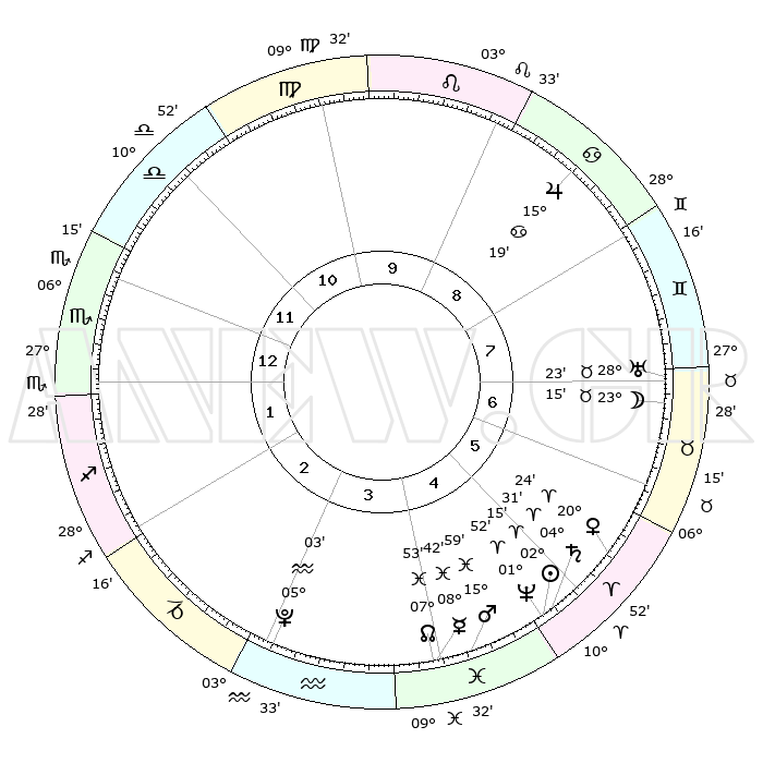 | | ΘΕΣΕΙΣ ΠΛΑΝΗΤΩΝ ΑΣΤΡΟΛΟΓΙΚΟΥ ΧΑΡΤΗ ΤΗΣ ΣΤΙΓΜΗΣ ΑΥΤΗΣ | | | | Πλανήτης | Ζώδιο | Μοίρες | Δεκαήμ. | Σε οίκο | Απόκλιση | | Ακμές των οίκων | | Ηλιος | Κριός | 02°11' | Πρώτο | 5 | 00 N 52 | | 1ος | 04°43' | Σκορπιός | | Σελήνη | Ταύρος | 22°07' | Τρίτο | 7 | 23 N 08 | | 2ος | 03°26' | Τοξότης | | Ερμής | Ιχθείς | 08°41' | Πρώτο | 4 | 07 S 50 | | 3ος | 05°48' | Αιγόκερως | | Αφροδίτη | Κριός | 20°18' | Τρίτο | 6 | 07 N 12 | | 4ος | 10°19' | Υδροχόος | | Αρης | Ιχθείς | 15°55' | Δεύτερο | 5 | 06 S 32 | | 5ος | 13°09' | Ιχθείς | | Δίας | Καρκίνος | 15°18' | Δεύτερο | 9 | 22 N 55 | | 6ος | 11°22' | Κριός | | Κρόνος | Κριός | 04°31' | Πρώτο | 5 | 00 S 09 | | 7ος | 04°44' | Ταύρος | | Ουρανός | Ταύρος | 28°23' | Τρίτο | 7 | 19 N 38 | | 8ος | 03°26' | Δίδυμοι | | Ποσειδώνας | Κριός | 01°52' | Πρώτο | 5 | 00 S 27 | | 9ος | 05°48' | Καρκίνος | | Πλούτωνας | Υδροχόος | 05°03' | Πρώτο | 3 | 22 S 48 | | 10ος | 10°19' | Λέων | | Β. Δεσμός | Ιχθείς | 07°53' | Πρώτο | 4 | 08 S 36 | | 11ος | 13°09' | Παρθένος | | Ωροσκόπος | Σκορπιός | 04°43' | Πρώτο | | | 12ος | 11°22' | Ζυγός | | Μεσουράνημα | Λέων | 10°19' | Δεύτερο | | | |
