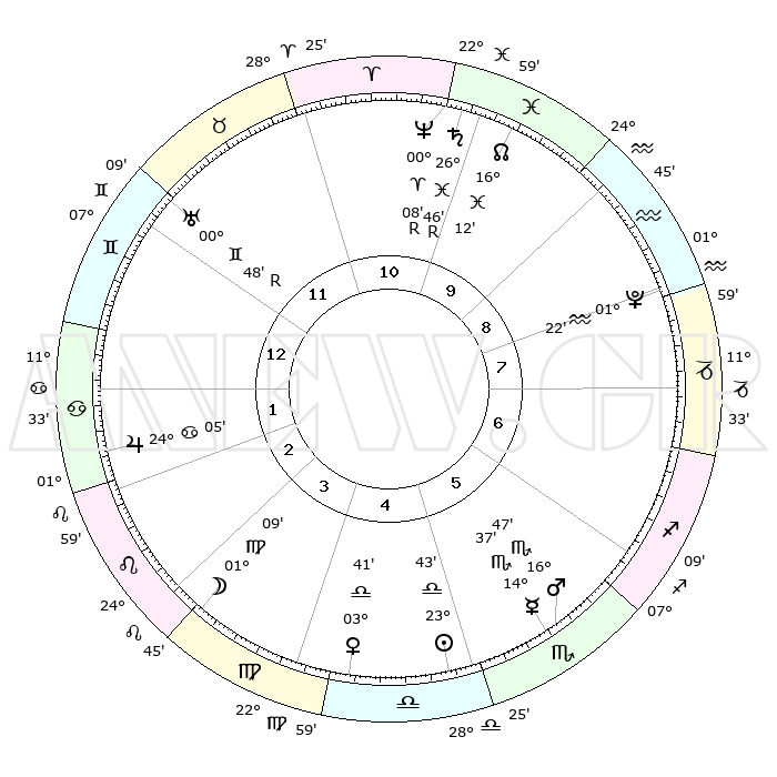 | ΘΕΣΕΙΣ ΠΛΑΝΗΤΩΝ ΑΣΤΡΟΛΟΓΙΚΟΥ ΧΑΡΤΗ ΤΗΣ ΣΤΙΓΜΗΣ ΑΥΤΗΣ | | Πλανήτης | Ζώδιο | Μοίρες | Δεκαήμ. | Σε οίκο | Απόκλιση | | Ακμές των οίκων | Ηλιος | Ζυγός | 22°34' | Τρίτο | 6 | 08 S 47 | | 1ος | 09°24' | Ταύρος | Σελήνη | Λέων | 16°19' | Δεύτερο | 4 | 18 N 33 | | 2ος | 09°04' | Δίδυμοι | Ερμής | Σκορπιός | 13°01' | Δεύτερο | 7 | 17 S 28 | | 3ος | 01°45' | Καρκίνος | Αφροδίτη | Ζυγός | 02°15' | Πρώτο | 6 | 00 N 30 | | 4ος | 23°33' | Καρκίνος | Αρης | Σκορπιός | 15°59' | Δεύτερο | 7 | 16 S 50 | | 5ος | 18°59' | Λέων | Δίας | Καρκίνος | 23°59' | Τρίτο | 4 | 21 N 21 | | 6ος | 23°35' | Παρθένος | Κρόνος | Ιχθείς | 26°50'R | Τρίτο | 12 | 03 S 33 | | 7ος | 09°24' | Σκορπιός | Ουρανός | Δίδυμοι | 00°50'R | Πρώτο | 1 | 20 N 07 | | 8ος | 09°04' | Τοξότης | Ποσειδώνας | Κριός | 00°10'R | Πρώτο | 12 | 01 S 12 | | 9ος | 01°45' | Αιγόκερως | Πλούτωνας | Υδροχόος | 01°22' | Πρώτο | 10 | 23 S 32 | | 10ος | 23°33' | Αιγόκερως | Β. Δεσμός | Ιχθείς | 16°16' | Δεύτερο | 11 | 05 S 25 | | 11ος | 18°59' | Υδροχόος | Ωροσκόπος | Ταύρος | 09°24' | Πρώτο | | | 12ος | 23°35' | Ιχθείς | Μεσουράνημα | Αιγόκερως | 23°33' | Τρίτο | | | |