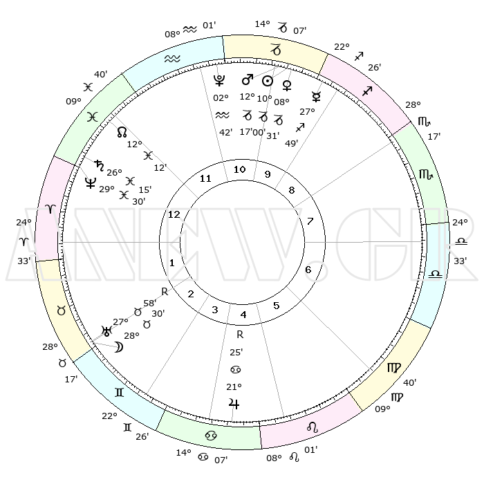 | | ΘΕΣΕΙΣ ΠΛΑΝΗΤΩΝ ΑΣΤΡΟΛΟΓΙΚΟΥ ΧΑΡΤΗ ΤΗΣ ΣΤΙΓΜΗΣ ΑΥΤΗΣ | | | | Πλανήτης | Ζώδιο | Μοίρες | Δεκαήμ. | Σε οίκο | Απόκλιση | | Ακμές των οίκων | | Ηλιος | Αιγόκερως | 09°57' | Πρώτο | 10 | 23 S 04 | | 1ος | 16°37' | Ιχθείς | | Σελήνη | Ταύρος | 27°31' | Τρίτο | 2 | 24 N 24 | | 2ος | 29°48' | Κριός | | Ερμής | Τοξότης | 27°43' | Τρίτο | 10 | 23 S 55 | | 3ος | 29°24' | Ταύρος | | Αφροδίτη | Αιγόκερως | 08°27' | Πρώτο | 10 | 23 S 39 | | 4ος | 22°26' | Δίδυμοι | | Αρης | Αιγόκερως | 12°14' | Δεύτερο | 10 | 23 S 45 | | 5ος | 14°17' | Καρκίνος | | Δίας | Καρκίνος | 21°26'R | Τρίτο | 5 | 21 N 58 | | 6ος | 09°47' | Λέων | | Κρόνος | Ιχθείς | 26°15' | Τρίτο | 1 | 03 S 34 | | 7ος | 16°37' | Παρθένος | | Ουρανός | Ταύρος | 27°58'R | Τρίτο | 2 | 19 N 30 | | 8ος | 29°48' | Ζυγός | | Ποσειδώνας | Ιχθείς | 29°30' | Τρίτο | 1 | 01 S 25 | | 9ος | 29°24' | Σκορπιός | | Πλούτωνας | Υδροχόος | 02°42' | Πρώτο | 11 | 23 S 13 | | 10ος | 22°26' | Τοξότης | | Β. Δεσμός | Ιχθείς | 12°12' | Δεύτερο | 12 | 06 S 59 | | 11ος | 14°17' | Αιγόκερως | | Ωροσκόπος | Ιχθείς | 16°37' | Δεύτερο | | | 12ος | 09°47' | Υδροχόος | | Μεσουράνημα | Τοξότης | 22°26' | Τρίτο | | | |
