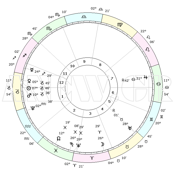 | | ΘΕΣΕΙΣ ΠΛΑΝΗΤΩΝ ΑΣΤΡΟΛΟΓΙΚΟΥ ΧΑΡΤΗ ΤΗΣ ΣΤΙΓΜΗΣ ΑΥΤΗΣ | | | | Πλανήτης | Ζώδιο | Μοίρες | Δεκαήμ. | Σε οίκο | Απόκλιση | | Ακμές των οίκων | | Ηλιος | Αιγόκερως | 07°42' | Πρώτο | 1 | 23 S 13 | | 1ος | 18°35' | Τοξότης | | Σελήνη | Κριός | 25°29' | Τρίτο | 4 | 13 N 09 | | 2ος | 23°01' | Αιγόκερως | | Ερμής | Τοξότης | 24°23' | Τρίτο | 1 | 23 S 34 | | 3ος | 01°46' | Ιχθείς | | Αφροδίτη | Αιγόκερως | 05°40' | Πρώτο | 1 | 23 S 43 | | 4ος | 07°11' | Κριός | | Αρης | Αιγόκερως | 10°32' | Δεύτερο | 1 | 23 S 53 | | 5ος | 05°23' | Ταύρος | | Δίας | Καρκίνος | 21°43'R | Τρίτο | 7 | 21 N 55 | | 6ος | 28°09' | Ταύρος | | Κρόνος | Ιχθείς | 26°08' | Τρίτο | 3 | 03 S 37 | | 7ος | 18°35' | Δίδυμοι | | Ουρανός | Ταύρος | 28°01'R | Τρίτο | 5 | 19 N 31 | | 8ος | 23°01' | Καρκίνος | | Ποσειδώνας | Ιχθείς | 29°29' | Τρίτο | 3 | 01 S 26 | | 9ος | 01°46' | Παρθένος | | Πλούτωνας | Υδροχόος | 02°38' | Πρώτο | 2 | 23 S 14 | | 10ος | 07°11' | Ζυγός | | Β. Δεσμός | Ιχθείς | 12°19' | Δεύτερο | 3 | 06 S 56 | | 11ος | 05°23' | Σκορπιός | | Ωροσκόπος | Τοξότης | 18°35' | Δεύτερο | | | 12ος | 28°09' | Σκορπιός | | Μεσουράνημα | Ζυγός | 07°11' | Πρώτο | | | |