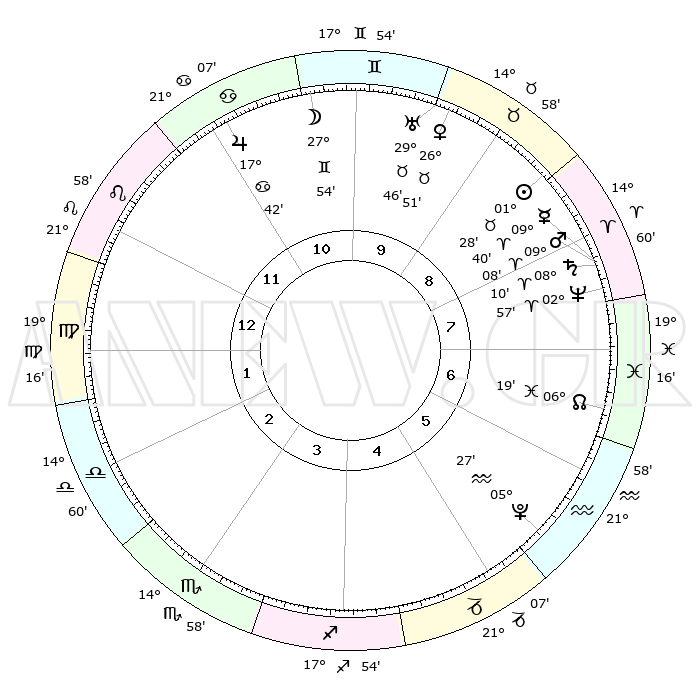 | | ΘΕΣΕΙΣ ΠΛΑΝΗΤΩΝ ΑΣΤΡΟΛΟΓΙΚΟΥ ΧΑΡΤΗ ΤΗΣ ΣΤΙΓΜΗΣ ΑΥΤΗΣ | | | | Πλανήτης | Ζώδιο | Μοίρες | Δεκαήμ. | Σε οίκο | Απόκλιση | | Ακμές των οίκων | | Ηλιος | Ταύρος | 01°24' | Πρώτο | 9 | 11 N 58 | | 1ος | 00°45' | Παρθένος | | Σελήνη | Δίδυμοι | 26°59' | Τρίτο | 10 | 28 N 12 | | 2ος | 24°41' | Παρθένος | | Ερμής | Κριός | 09°34' | Πρώτο | 8 | 01 N 24 | | 3ος | 23°26' | Ζυγός | | Αφροδίτη | Ταύρος | 26°46' | Τρίτο | 10 | 19 N 53 | | 4ος | 26°21' | Σκορπιός | | Αρης | Κριός | 09°05' | Πρώτο | 8 | 02 N 44 | | 5ος | 00°29' | Αιγόκερως | | Δίας | Καρκίνος | 17°41' | Δεύτερο | 11 | 22 N 39 | | 6ος | 02°23' | Υδροχόος | | Κρόνος | Κριός | 08°10' | Πρώτο | 8 | 01 N 15 | | 7ος | 00°45' | Ιχθείς | | Ουρανός | Ταύρος | 29°46' | Τρίτο | 10 | 19 N 56 | | 8ος | 24°41' | Ιχθείς | | Ποσειδώνας | Κριός | 02°57' | Πρώτο | 8 | 00 S 02 | | 9ος | 23°26' | Κριός | | Πλούτωνας | Υδροχόος | 05°27' | Πρώτο | 6 | 22 S 48 | | 10ος | 26°21' | Ταύρος | | Β. Δεσμός | Ιχθείς | 06°19' | Πρώτο | 7 | 09 S 11 | | 11ος | 00°29' | Καρκίνος | | Ωροσκόπος | Παρθένος | 00°45' | Πρώτο | | | 12ος | 02°23' | Λέων | | Μεσουράνημα | Ταύρος | 26°21' | Τρίτο | | | |