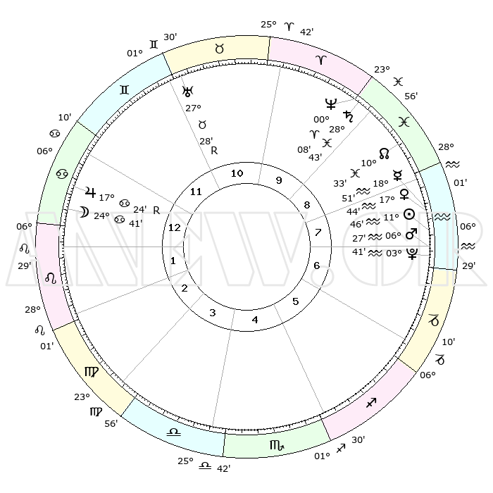 | | ΘΕΣΕΙΣ ΠΛΑΝΗΤΩΝ ΑΣΤΡΟΛΟΓΙΚΟΥ ΧΑΡΤΗ ΤΗΣ ΣΤΙΓΜΗΣ ΑΥΤΗΣ | | | | Πλανήτης | Ζώδιο | Μοίρες | Δεκαήμ. | Σε οίκο | Απόκλιση | | Ακμές των οίκων | | Ηλιος | Υδροχόος | 11°42' | Δεύτερο | 8 | 17 S 16 | | 1ος | 18°29' | Καρκίνος | | Σελήνη | Καρκίνος | 23°48' | Τρίτο | 1 | 25 N 00 | | 2ος | 08°59' | Λέων | | Ερμής | Υδροχόος | 18°44' | Δεύτερο | 8 | 17 S 01 | | 3ος | 02°33' | Παρθένος | | Αφροδίτη | Υδροχόος | 17°39' | Δεύτερο | 8 | 16 S 50 | | 4ος | 01°55' | Ζυγός | | Αρης | Υδροχόος | 06°24' | Πρώτο | 7 | 19 S 41 | | 5ος | 07°51' | Σκορπιός | | Δίας | Καρκίνος | 17°24'R | Δεύτερο | 12 | 22 N 36 | | 6ος | 15°29' | Τοξότης | | Κρόνος | Ιχθείς | 28°43' | Τρίτο | 9 | 02 S 30 | | 7ος | 18°29' | Αιγόκερως | | Ουρανός | Ταύρος | 27°28'R | Τρίτο | 11 | 19 N 24 | | 8ος | 08°59' | Υδροχόος | | Ποσειδώνας | Κριός | 00°08' | Πρώτο | 9 | 01 S 09 | | 9ος | 02°33' | Ιχθείς | | Πλούτωνας | Υδροχόος | 03°41' | Πρώτο | 7 | 23 S 01 | | 10ος | 01°55' | Κριός | | Β. Δεσμός | Ιχθείς | 10°33' | Δεύτερο | 9 | 07 S 37 | | 11ος | 07°51' | Ταύρος | | Ωροσκόπος | Καρκίνος | 18°29' | Δεύτερο | | | 12ος | 15°29' | Δίδυμοι | | Μεσουράνημα | Κριός | 01°55' | Πρώτο | | | |
