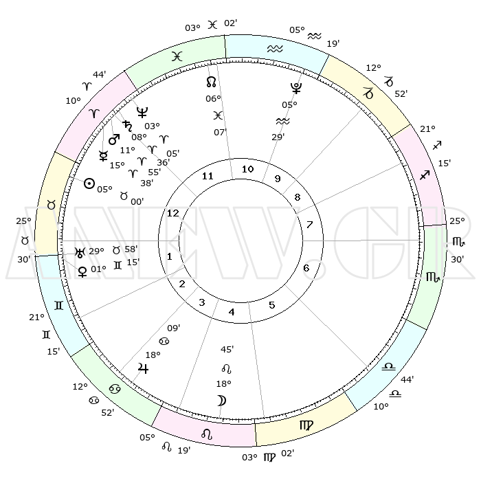 | | ΘΕΣΕΙΣ ΠΛΑΝΗΤΩΝ ΑΣΤΡΟΛΟΓΙΚΟΥ ΧΑΡΤΗ ΤΗΣ ΣΤΙΓΜΗΣ ΑΥΤΗΣ | | | | Πλανήτης | Ζώδιο | Μοίρες | Δεκαήμ. | Σε οίκο | Απόκλιση | | Ακμές των οίκων | | Ηλιος | Ταύρος | 04°53' | Πρώτο | 2 | 13 N 09 | | 1ος | 18°42' | Ιχθείς | | Σελήνη | Λέων | 17°05' | Δεύτερο | 6 | 17 N 24 | | 2ος | 01°29' | Ταύρος | | Ερμής | Κριός | 15°26' | Δεύτερο | 1 | 03 N 50 | | 3ος | 00°43' | Δίδυμοι | | Αφροδίτη | Δίδυμοι | 01°06' | Πρώτο | 3 | 21 N 00 | | 4ος | 23°38' | Δίδυμοι | | Αρης | Κριός | 11°50' | Δεύτερο | 1 | 03 N 49 | | 5ος | 15°32' | Καρκίνος | | Δίας | Καρκίνος | 18°08' | Δεύτερο | 5 | 22 N 35 | | 6ος | 11°18' | Λέων | | Κρόνος | Κριός | 08°35' | Πρώτο | 1 | 01 N 25 | | 7ος | 18°42' | Παρθένος | | Ουρανός | Ταύρος | 29°57' | Τρίτο | 2 | 19 N 58 | | 8ος | 01°29' | Σκορπιός | | Ποσειδώνας | Κριός | 03°04' | Πρώτο | 1 | 00 N 01 | | 9ος | 00°43' | Τοξότης | | Πλούτωνας | Υδροχόος | 05°29' | Πρώτο | 11 | 22 S 48 | | 10ος | 23°38' | Τοξότης | | Β. Δεσμός | Ιχθείς | 06°08' | Πρώτο | 12 | 09 S 16 | | 11ος | 15°32' | Αιγόκερως | | Ωροσκόπος | Ιχθείς | 18°42' | Δεύτερο | | | 12ος | 11°18' | Υδροχόος | | Μεσουράνημα | Τοξότης | 23°38' | Τρίτο | | | |