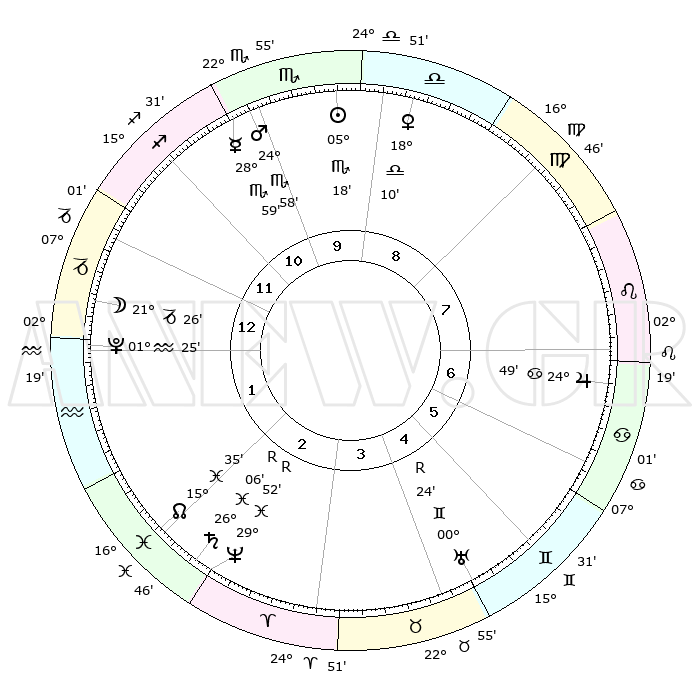| | ΘΕΣΕΙΣ ΠΛΑΝΗΤΩΝ ΑΣΤΡΟΛΟΓΙΚΟΥ ΧΑΡΤΗ ΤΗΣ ΣΤΙΓΜΗΣ ΑΥΤΗΣ | | | | Πλανήτης | Ζώδιο | Μοίρες | Δεκαήμ. | Σε οίκο | Απόκλιση | | Ακμές των οίκων | | Ηλιος | Σκορπιός | 05°12' | Πρώτο | 10 | 13 S 15 | | 1ος | 29°30' | Τοξότης | | Σελήνη | Αιγόκερως | 20°21' | Τρίτο | 1 | 26 S 08 | | 2ος | 06°31' | Υδροχόος | | Ερμής | Σκορπιός | 28°53' | Τρίτο | 11 | 22 S 39 | | 3ος | 16°29' | Ιχθείς | | Αφροδίτη | Ζυγός | 18°04' | Δεύτερο | 9 | 05 S 41 | | 4ος | 20°30' | Κριός | | Αρης | Σκορπιός | 24°54' | Τρίτο | 11 | 19 S 20 | | 5ος | 16°54' | Ταύρος | | Δίας | Καρκίνος | 24°49' | Τρίτο | 7 | 21 N 14 | | 6ος | 08°44' | Δίδυμοι | | Κρόνος | Ιχθείς | 26°06'R | Τρίτο | 3 | 03 S 49 | | 7ος | 29°30' | Δίδυμοι | | Ουρανός | Δίδυμοι | 00°24'R | Πρώτο | 5 | 20 N 02 | | 8ος | 06°31' | Λέων | | Ποσειδώνας | Ιχθείς | 29°52'R | Τρίτο | 3 | 01 S 19 | | 9ος | 16°29' | Παρθένος | | Πλούτωνας | Υδροχόος | 01°25' | Πρώτο | 1 | 23 S 31 | | 10ος | 20°30' | Ζυγός | | Β. Δεσμός | Ιχθείς | 15°35' | Δεύτερο | 2 | 05 S 41 | | 11ος | 16°54' | Σκορπιός | | Ωροσκόπος | Τοξότης | 29°30' | Τρίτο | | | 12ος | 08°44' | Τοξότης | | Μεσουράνημα | Ζυγός | 20°30' | Τρίτο | | | |