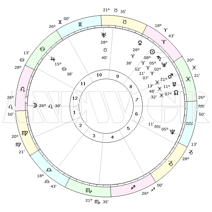 | | ΘΕΣΕΙΣ ΠΛΑΝΗΤΩΝ ΑΣΤΡΟΛΟΓΙΚΟΥ ΧΑΡΤΗ ΤΗΣ ΣΤΙΓΜΗΣ ΑΥΤΗΣ | | | | Πλανήτης | Ζώδιο | Μοίρες | Δεκαήμ. | Σε οίκο | Απόκλιση | | Ακμές των οίκων | | Ηλιος | Κριός | 08°48' | Πρώτο | 9 | 03 N 29 | | 1ος | 09°32' | Λέων | | Σελήνη | Λέων | 25°42' | Τρίτο | 1 | 14 N 04 | | 2ος | 01°19' | Παρθένος | | Ερμής | Ιχθείς | 11°46' | Δεύτερο | 8 | 07 S 58 | | 3ος | 27°39' | Παρθένος | | Αφροδίτη | Κριός | 28°34' | Τρίτο | 9 | 10 N 27 | | 4ος | 29°41' | Ζυγός | | Αρης | Ιχθείς | 21°10' | Τρίτο | 8 | 04 S 28 | | 5ος | 05°19' | Τοξότης | | Δίας | Καρκίνος | 15°38' | Δεύτερο | 12 | 22 N 53 | | 6ος | 09°32' | Αιγόκερως | | Κρόνος | Κριός | 05°21' | Πρώτο | 9 | 00 N 10 | | 7ος | 09°32' | Υδροχόος | | Ουρανός | Ταύρος | 28°39' | Τρίτο | 10 | 19 N 41 | | 8ος | 01°19' | Ιχθείς | | Ποσειδώνας | Κριός | 02°07' | Πρώτο | 9 | 00 S 22 | | 9ος | 27°39' | Ιχθείς | | Πλούτωνας | Υδροχόος | 05°11' | Πρώτο | 6 | 22 S 48 | | 10ος | 29°41' | Κριός | | Β. Δεσμός | Ιχθείς | 07°32' | Πρώτο | 8 | 08 S 44 | | 11ος | 05°19' | Δίδυμοι | | Ωροσκόπος | Λέων | 09°32' | Πρώτο | | | 12ος | 09°32' | Καρκίνος | | Μεσουράνημα | Κριός | 29°41' | Τρίτο | | | |