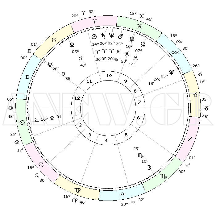 | | ΘΕΣΕΙΣ ΠΛΑΝΗΤΩΝ ΑΣΤΡΟΛΟΓΙΚΟΥ ΧΑΡΤΗ ΤΗΣ ΣΤΙΓΜΗΣ ΑΥΤΗΣ | | | | Πλανήτης | Ζώδιο | Μοίρες | Δεκαήμ. | Σε οίκο | Απόκλιση | | Ακμές των οίκων | | Ηλιος | Κριός | 14°32' | Δεύτερο | 11 | 05 N 44 | | 1ος | 11°22' | Δίδυμοι | | Σελήνη | Σκορπιός | 09°38' | Πρώτο | 6 | 18 S 59 | | 2ος | 04°09' | Καρκίνος | | Ερμής | Ιχθείς | 16°46' | Δεύτερο | 10 | 06 S 51 | | 3ος | 25°22' | Καρκίνος | | Αφροδίτη | Ταύρος | 05°42' | Πρώτο | 12 | 13 N 08 | | 4ος | 19°09' | Λέων | | Αρης | Ιχθείς | 25°42' | Τρίτο | 11 | 02 S 39 | | 5ος | 19°42' | Παρθένος | | Δίας | Καρκίνος | 16°01' | Δεύτερο | 2 | 22 N 51 | | 6ος | 29°33' | Ζυγός | | Κρόνος | Κριός | 06°04' | Πρώτο | 11 | 00 N 27 | | 7ος | 11°22' | Τοξότης | | Ουρανός | Ταύρος | 28°55' | Τρίτο | 12 | 19 N 45 | | 8ος | 04°09' | Αιγόκερως | | Ποσειδώνας | Κριός | 02°20' | Πρώτο | 11 | 00 S 16 | | 9ος | 25°22' | Αιγόκερως | | Πλούτωνας | Υδροχόος | 05°16' | Πρώτο | 9 | 22 S 47 | | 10ος | 19°09' | Υδροχόος | | Β. Δεσμός | Ιχθείς | 07°14' | Πρώτο | 10 | 08 S 51 | | 11ος | 19°42' | Ιχθείς | | Ωροσκόπος | Δίδυμοι | 11°22' | Δεύτερο | | | 12ος | 29°33' | Κριός | | Μεσουράνημα | Υδροχόος | 19°09' | Δεύτερο | | | |