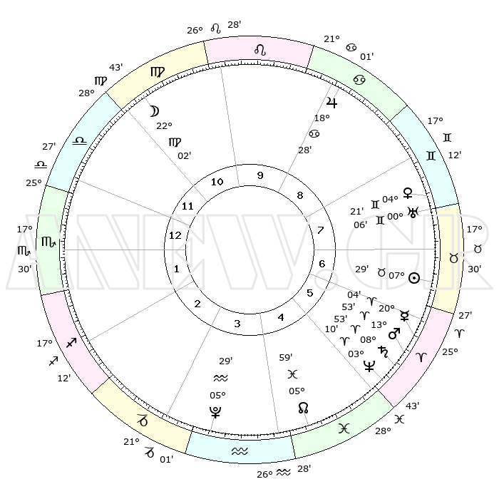| | ΘΕΣΕΙΣ ΠΛΑΝΗΤΩΝ ΑΣΤΡΟΛΟΓΙΚΟΥ ΧΑΡΤΗ ΤΗΣ ΣΤΙΓΜΗΣ ΑΥΤΗΣ | | | | Πλανήτης | Ζώδιο | Μοίρες | Δεκαήμ. | Σε οίκο | Απόκλιση | | Ακμές των οίκων | | Ηλιος | Ταύρος | 07°26' | Πρώτο | 7 | 13 N 59 | | 1ος | 28°22' | Ζυγός | | Σελήνη | Παρθένος | 21°11' | Τρίτο | 11 | 02 N 22 | | 2ος | 26°41' | Σκορπιός | | Ερμής | Κριός | 19°57' | Δεύτερο | 6 | 05 N 43 | | 3ος | 28°31' | Τοξότης | | Αφροδίτη | Δίδυμοι | 04°17' | Πρώτο | 8 | 21 N 44 | | 4ος | 02°36' | Υδροχόος | | Αρης | Κριός | 13°50' | Δεύτερο | 6 | 04 N 37 | | 5ος | 05°32' | Ιχθείς | | Δίας | Καρκίνος | 18°28' | Δεύτερο | 9 | 22 N 33 | | 6ος | 04°21' | Κριός | | Κρόνος | Κριός | 08°53' | Πρώτο | 6 | 01 N 32 | | 7ος | 28°22' | Κριός | | Ουρανός | Δίδυμοι | 00°06' | Πρώτο | 8 | 20 N 00 | | 8ος | 26°41' | Ταύρος | | Ποσειδώνας | Κριός | 03°09' | Πρώτο | 5 | 00 N 03 | | 9ος | 28°31' | Δίδυμοι | | Πλούτωνας | Υδροχόος | 05°29' | Πρώτο | 4 | 22 S 48 | | 10ος | 02°36' | Λέων | | Β. Δεσμός | Ιχθείς | 05°59' | Πρώτο | 5 | 09 S 19 | | 11ος | 05°32' | Παρθένος | | Ωροσκόπος | Ζυγός | 28°22' | Τρίτο | | | 12ος | 04°21' | Ζυγός | | Μεσουράνημα | Λέων | 02°36' | Πρώτο | | | |