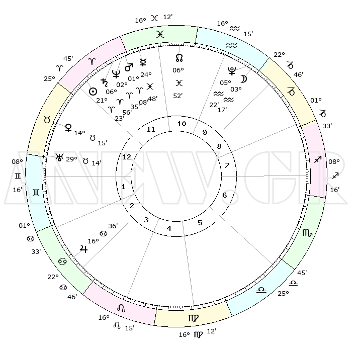 | | ΘΕΣΕΙΣ ΠΛΑΝΗΤΩΝ ΑΣΤΡΟΛΟΓΙΚΟΥ ΧΑΡΤΗ ΤΗΣ ΣΤΙΓΜΗΣ ΑΥΤΗΣ | | | | Πλανήτης | Ζώδιο | Μοίρες | Δεκαήμ. | Σε οίκο | Απόκλιση | | Ακμές των οίκων | | Ηλιος | Κριός | 21°19' | Τρίτο | 12 | 08 N 19 | | 1ος | 03°15' | Ταύρος | | Σελήνη | Υδροχόος | 02°21' | Πρώτο | 10 | 22 S 35 | | 2ος | 04°34' | Δίδυμοι | | Ερμής | Ιχθείς | 24°42' | Τρίτο | 12 | 04 S 20 | | 3ος | 27°49' | Δίδυμοι | | Αφροδίτη | Ταύρος | 14°10' | Δεύτερο | 1 | 16 N 05 | | 4ος | 19°31' | Καρκίνος | | Αρης | Κριός | 01°05' | Πρώτο | 12 | 00 S 29 | | 5ος | 14°15' | Λέων | | Δίας | Καρκίνος | 16°35' | Δεύτερο | 3 | 22 N 47 | | 6ος | 17°37' | Παρθένος | | Κρόνος | Κριός | 06°55' | Πρώτο | 12 | 00 N 47 | | 7ος | 03°15' | Σκορπιός | | Ουρανός | Ταύρος | 29°14' | Τρίτο | 1 | 19 N 49 | | 8ος | 04°34' | Τοξότης | | Ποσειδώνας | Κριός | 02°35' | Πρώτο | 12 | 00 S 11 | | 9ος | 27°49' | Τοξότης | | Πλούτωνας | Υδροχόος | 05°22' | Πρώτο | 10 | 22 S 47 | | 10ος | 19°31' | Αιγόκερως | | Β. Δεσμός | Ιχθείς | 06°52' | Πρώτο | 11 | 08 S 59 | | 11ος | 14°15' | Υδροχόος | | Ωροσκόπος | Ταύρος | 03°15' | Πρώτο | | | 12ος | 17°37' | Ιχθείς | | Μεσουράνημα | Αιγόκερως | 19°31' | Δεύτερο | | | |