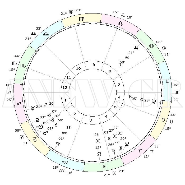 | | ΘΕΣΕΙΣ ΠΛΑΝΗΤΩΝ ΑΣΤΡΟΛΟΓΙΚΟΥ ΧΑΡΤΗ ΤΗΣ ΣΤΙΓΜΗΣ ΑΥΤΗΣ | | | | Πλανήτης | Ζώδιο | Μοίρες | Δεκαήμ. | Σε οίκο | Απόκλιση | | Ακμές των οίκων | | Ηλιος | Αιγόκερως | 05°33' | Πρώτο | 2 | 23 S 19 | | 1ος | 15°21' | Σκορπιός | | Σελήνη | Ιχθείς | 26°29' | Τρίτο | 5 | 00 S 10 | | 2ος | 14°52' | Τοξότης | | Ερμής | Τοξότης | 21°13' | Τρίτο | 2 | 23 S 08 | | 3ος | 18°24' | Αιγόκερως | | Αφροδίτη | Αιγόκερως | 03°01' | Πρώτο | 2 | 23 S 43 | | 4ος | 23°42' | Υδροχόος | | Αρης | Αιγόκερως | 08°56' | Πρώτο | 2 | 23 S 59 | | 5ος | 26°06' | Ιχθείς | | Δίας | Καρκίνος | 21°59'R | Τρίτο | 9 | 21 N 52 | | 6ος | 23°05' | Κριός | | Κρόνος | Ιχθείς | 26°01' | Τρίτο | 4 | 03 S 40 | | 7ος | 15°21' | Ταύρος | | Ουρανός | Ταύρος | 28°05'R | Τρίτο | 7 | 19 N 32 | | 8ος | 14°52' | Δίδυμοι | | Ποσειδώνας | Ιχθείς | 29°27' | Τρίτο | 5 | 01 S 27 | | 9ος | 18°24' | Καρκίνος | | Πλούτωνας | Υδροχόος | 02°35' | Πρώτο | 3 | 23 S 15 | | 10ος | 23°42' | Λέων | | Β. Δεσμός | Ιχθείς | 12°26' | Δεύτερο | 4 | 06 S 54 | | 11ος | 26°06' | Παρθένος | | Ωροσκόπος | Σκορπιός | 15°21' | Δεύτερο | | | 12ος | 23°05' | Ζυγός | | Μεσουράνημα | Λέων | 23°42' | Τρίτο | | | |