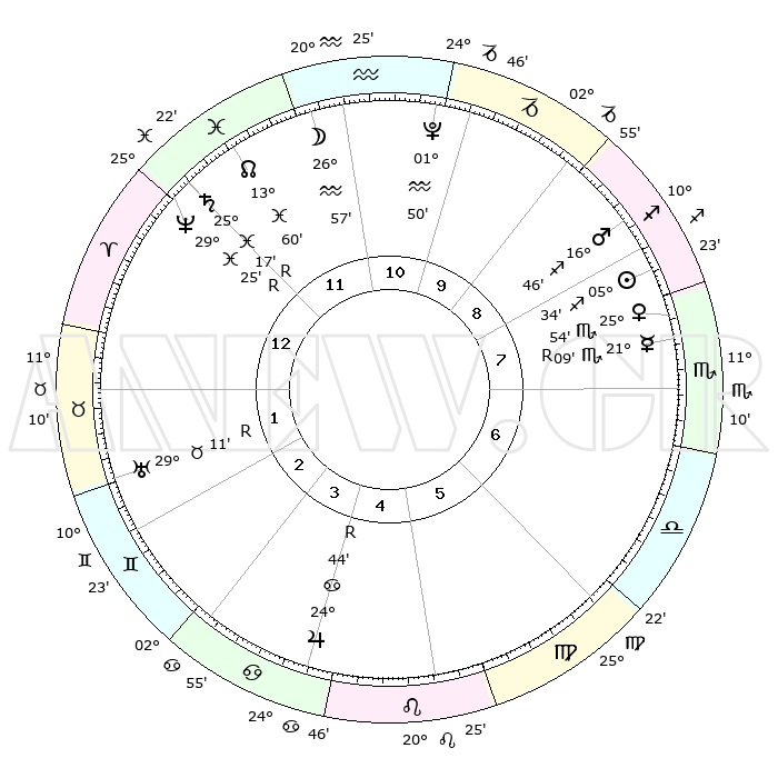 | | ΘΕΣΕΙΣ ΠΛΑΝΗΤΩΝ ΑΣΤΡΟΛΟΓΙΚΟΥ ΧΑΡΤΗ ΤΗΣ ΣΤΙΓΜΗΣ ΑΥΤΗΣ | | | | Πλανήτης | Ζώδιο | Μοίρες | Δεκαήμ. | Σε οίκο | Απόκλιση | | Ακμές των οίκων | | Ηλιος | Τοξότης | 05°33' | Πρώτο | 8 | 21 S 13 | | 1ος | 28°52' | Κριός | | Σελήνη | Υδροχόος | 26°39' | Τρίτο | 11 | 14 S 04 | | 2ος | 01°24' | Δίδυμοι | | Ερμής | Σκορπιός | 21°09'R | Τρίτο | 7 | 15 S 47 | | 3ος | 25°04' | Δίδυμοι | | Αφροδίτη | Σκορπιός | 25°52' | Τρίτο | 7 | 18 S 25 | | 4ος | 16°45' | Καρκίνος | | Αρης | Τοξότης | 16°45' | Δεύτερο | 8 | 23 S 24 | | 5ος | 11°03' | Λέων | | Δίας | Καρκίνος | 24°44'R | Τρίτο | 4 | 21 N 19 | | 6ος | 13°32' | Παρθένος | | Κρόνος | Ιχθείς | 25°17'R | Τρίτο | 12 | 04 S 04 | | 7ος | 28°52' | Ζυγός | | Ουρανός | Ταύρος | 29°11'R | Τρίτο | 1 | 19 N 46 | | 8ος | 01°24' | Τοξότης | | Ποσειδώνας | Ιχθείς | 29°25'R | Τρίτο | 12 | 01 S 28 | | 9ος | 25°04' | Τοξότης | | Πλούτωνας | Υδροχόος | 01°50' | Πρώτο | 10 | 23 S 25 | | 10ος | 16°45' | Αιγόκερως | | Β. Δεσμός | Ιχθείς | 13°60' | Δεύτερο | 12 | 06 S 18 | | 11ος | 11°03' | Υδροχόος | | Ωροσκόπος | Κριός | 28°52' | Τρίτο | | | 12ος | 13°32' | Ιχθείς | | Μεσουράνημα | Αιγόκερως | 16°45' | Δεύτερο | | | |