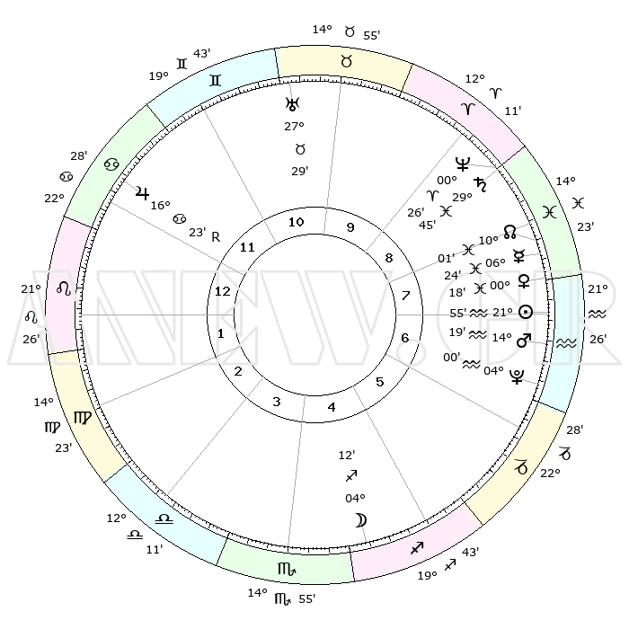 | | ΘΕΣΕΙΣ ΠΛΑΝΗΤΩΝ ΑΣΤΡΟΛΟΓΙΚΟΥ ΧΑΡΤΗ ΤΗΣ ΣΤΙΓΜΗΣ ΑΥΤΗΣ | | | | Πλανήτης | Ζώδιο | Μοίρες | Δεκαήμ. | Σε οίκο | Απόκλιση | | Ακμές των οίκων | | Ηλιος | Υδροχόος | 21°53' | Τρίτο | 7 | 14 S 13 | | 1ος | 09°34' | Λέων | | Σελήνη | Τοξότης | 03°43' | Πρώτο | 4 | 26 S 02 | | 2ος | 01°22' | Παρθένος | | Ερμής | Ιχθείς | 06°20' | Πρώτο | 8 | 09 S 56 | | 3ος | 27°42' | Παρθένος | | Αφροδίτη | Ιχθείς | 00°15' | Πρώτο | 7 | 12 S 45 | | 4ος | 29°44' | Ζυγός | | Αρης | Υδροχόος | 14°17' | Δεύτερο | 7 | 17 S 34 | | 5ος | 05°22' | Τοξότης | | Δίας | Καρκίνος | 16°23'R | Δεύτερο | 12 | 22 N 45 | | 6ος | 09°35' | Αιγόκερως | | Κρόνος | Ιχθείς | 29°45' | Τρίτο | 9 | 02 S 05 | | 7ος | 09°34' | Υδροχόος | | Ουρανός | Ταύρος | 27°29' | Τρίτο | 10 | 19 N 25 | | 8ος | 01°22' | Ιχθείς | | Ποσειδώνας | Κριός | 00°26' | Πρώτο | 9 | 01 S 02 | | 9ος | 27°42' | Ιχθείς | | Πλούτωνας | Υδροχόος | 04°00' | Πρώτο | 6 | 22 S 58 | | 10ος | 29°44' | Κριός | | Β. Δεσμός | Ιχθείς | 10°01' | Δεύτερο | 8 | 07 S 49 | | 11ος | 05°22' | Δίδυμοι | | Ωροσκόπος | Λέων | 09°34' | Πρώτο | | | 12ος | 09°35' | Καρκίνος | | Μεσουράνημα | Κριός | 29°44' | Τρίτο | | | |
