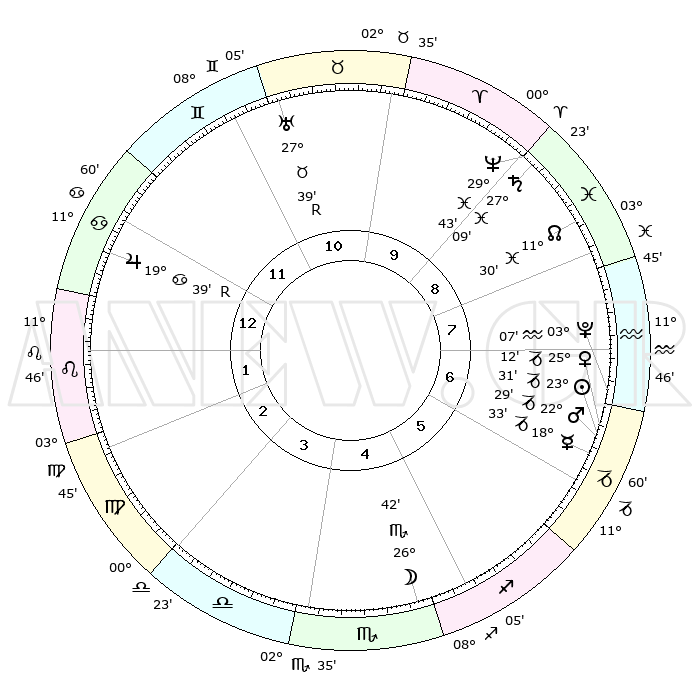 | | ΘΕΣΕΙΣ ΠΛΑΝΗΤΩΝ ΑΣΤΡΟΛΟΓΙΚΟΥ ΧΑΡΤΗ ΤΗΣ ΣΤΙΓΜΗΣ ΑΥΤΗΣ | | | | Πλανήτης | Ζώδιο | Μοίρες | Δεκαήμ. | Σε οίκο | Απόκλιση | | Ακμές των οίκων | | Ηλιος | Αιγόκερως | 23°26' | Τρίτο | 7 | 21 S 24 | | 1ος | 19°35' | Καρκίνος | | Σελήνη | Σκορπιός | 25°49' | Τρίτο | 5 | 24 S 01 | | 2ος | 10°06' | Λέων | | Ερμής | Αιγόκερως | 18°26' | Δεύτερο | 6 | 23 S 51 | | 3ος | 03°48' | Παρθένος | | Αφροδίτη | Αιγόκερως | 25°06' | Τρίτο | 7 | 22 S 02 | | 4ος | 03°21' | Ζυγός | | Αρης | Αιγόκερως | 22°26' | Τρίτο | 7 | 22 S 31 | | 5ος | 09°19' | Σκορπιός | | Δίας | Καρκίνος | 19°40'R | Δεύτερο | 1 | 22 N 15 | | 6ος | 16°47' | Τοξότης | | Κρόνος | Ιχθείς | 27°08' | Τρίτο | 9 | 03 S 11 | | 7ος | 19°35' | Αιγόκερως | | Ουρανός | Ταύρος | 27°39'R | Τρίτο | 11 | 19 N 27 | | 8ος | 10°06' | Υδροχόος | | Ποσειδώνας | Ιχθείς | 29°43' | Τρίτο | 9 | 01 S 20 | | 9ος | 03°48' | Ιχθείς | | Πλούτωνας | Υδροχόος | 03°07' | Πρώτο | 7 | 23 S 08 | | 10ος | 03°21' | Κριός | | Β. Δεσμός | Ιχθείς | 11°30' | Δεύτερο | 9 | 07 S 15 | | 11ος | 09°19' | Ταύρος | | Ωροσκόπος | Καρκίνος | 19°35' | Δεύτερο | | | 12ος | 16°47' | Δίδυμοι | | Μεσουράνημα | Κριός | 03°21' | Πρώτο | | | |