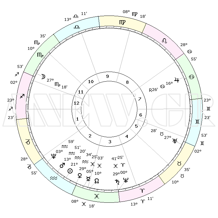 | | ΘΕΣΕΙΣ ΠΛΑΝΗΤΩΝ ΑΣΤΡΟΛΟΓΙΚΟΥ ΧΑΡΤΗ ΤΗΣ ΣΤΙΓΜΗΣ ΑΥΤΗΣ | | | | Πλανήτης | Ζώδιο | Μοίρες | Δεκαήμ. | Σε οίκο | Απόκλιση | | Ακμές των οίκων | | Ηλιος | Υδροχόος | 21°16' | Τρίτο | 3 | 14 S 24 | | 1ος | 04°46' | Τοξότης | | Σελήνη | Σκορπιός | 26°34' | Τρίτο | 12 | 24 S 22 | | 2ος | 06°36' | Αιγόκερως | | Ερμής | Ιχθείς | 05°19' | Πρώτο | 3 | 10 S 24 | | 3ος | 13°06' | Υδροχόος | | Αφροδίτη | Υδροχόος | 29°30' | Τρίτο | 3 | 13 S 00 | | 4ος | 19°12' | Ιχθείς | | Αρης | Υδροχόος | 13°48' | Δεύτερο | 3 | 17 S 42 | | 5ος | 19°35' | Κριός | | Δίας | Καρκίνος | 16°27'R | Δεύτερο | 8 | 22 N 44 | | 6ος | 14°00' | Ταύρος | | Κρόνος | Ιχθείς | 29°41' | Τρίτο | 4 | 02 S 06 | | 7ος | 04°46' | Δίδυμοι | | Ουρανός | Ταύρος | 27°28' | Τρίτο | 6 | 19 N 25 | | 8ος | 06°36' | Καρκίνος | | Ποσειδώνας | Κριός | 00°24' | Πρώτο | 4 | 01 S 02 | | 9ος | 13°06' | Λέων | | Πλούτωνας | Υδροχόος | 03°59' | Πρώτο | 2 | 22 S 58 | | 10ος | 19°12' | Παρθένος | | Β. Δεσμός | Ιχθείς | 10°03' | Δεύτερο | 3 | 07 S 48 | | 11ος | 19°35' | Ζυγός | | Ωροσκόπος | Τοξότης | 04°46' | Πρώτο | | | 12ος | 14°00' | Σκορπιός | | Μεσουράνημα | Παρθένος | 19°12' | Δεύτερο | | | |