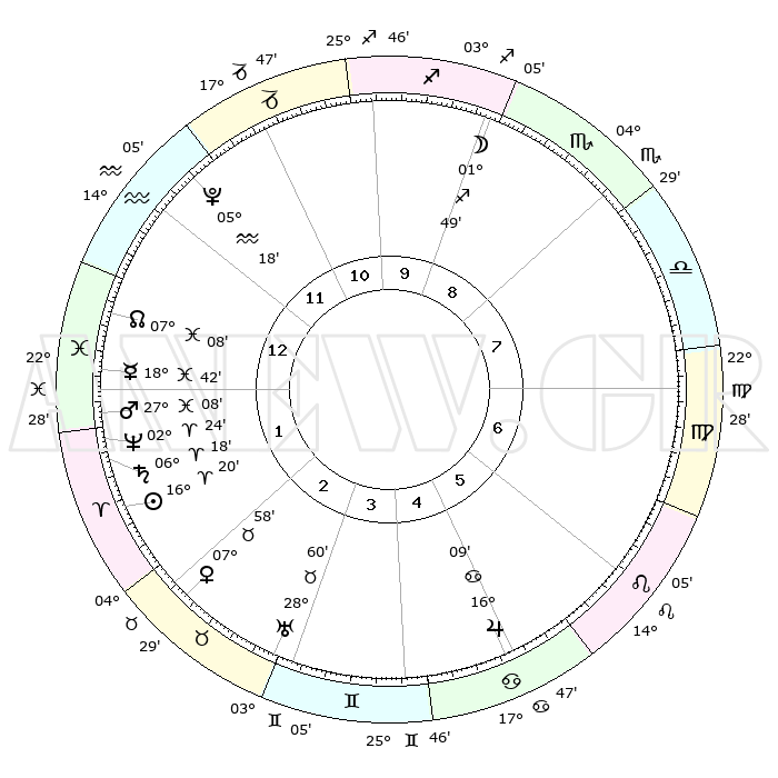 | | ΘΕΣΕΙΣ ΠΛΑΝΗΤΩΝ ΑΣΤΡΟΛΟΓΙΚΟΥ ΧΑΡΤΗ ΤΗΣ ΣΤΙΓΜΗΣ ΑΥΤΗΣ | | | | Πλανήτης | Ζώδιο | Μοίρες | Δεκαήμ. | Σε οίκο | Απόκλιση | | Ακμές των οίκων | | Ηλιος | Κριός | 16°17' | Δεύτερο | 2 | 06 N 24 | | 1ος | 18°51' | Υδροχόος | | Σελήνη | Τοξότης | 01°05' | Πρώτο | 9 | 25 S 23 | | 2ος | 04°40' | Κριός | | Ερμής | Ιχθείς | 18°38' | Δεύτερο | 1 | 06 S 19 | | 3ος | 09°36' | Ταύρος | | Αφροδίτη | Ταύρος | 07°53' | Πρώτο | 2 | 13 N 55 | | 4ος | 05°15' | Δίδυμοι | | Αρης | Ιχθείς | 27°05' | Τρίτο | 1 | 02 S 06 | | 5ος | 27°06' | Δίδυμοι | | Δίας | Καρκίνος | 16°09' | Δεύτερο | 5 | 22 N 50 | | 6ος | 19°38' | Καρκίνος | | Κρόνος | Κριός | 06°17' | Πρώτο | 2 | 00 N 32 | | 7ος | 18°51' | Λέων | | Ουρανός | Ταύρος | 28°59' | Τρίτο | 3 | 19 N 46 | | 8ος | 04°40' | Ζυγός | | Ποσειδώνας | Κριός | 02°24' | Πρώτο | 1 | 00 S 15 | | 9ος | 09°36' | Σκορπιός | | Πλούτωνας | Υδροχόος | 05°18' | Πρώτο | 12 | 22 S 47 | | 10ος | 05°15' | Τοξότης | | Β. Δεσμός | Ιχθείς | 07°08' | Πρώτο | 1 | 08 S 53 | | 11ος | 27°06' | Τοξότης | | Ωροσκόπος | Υδροχόος | 18°51' | Δεύτερο | | | 12ος | 19°38' | Αιγόκερως | | Μεσουράνημα | Τοξότης | 05°15' | Πρώτο | | | |