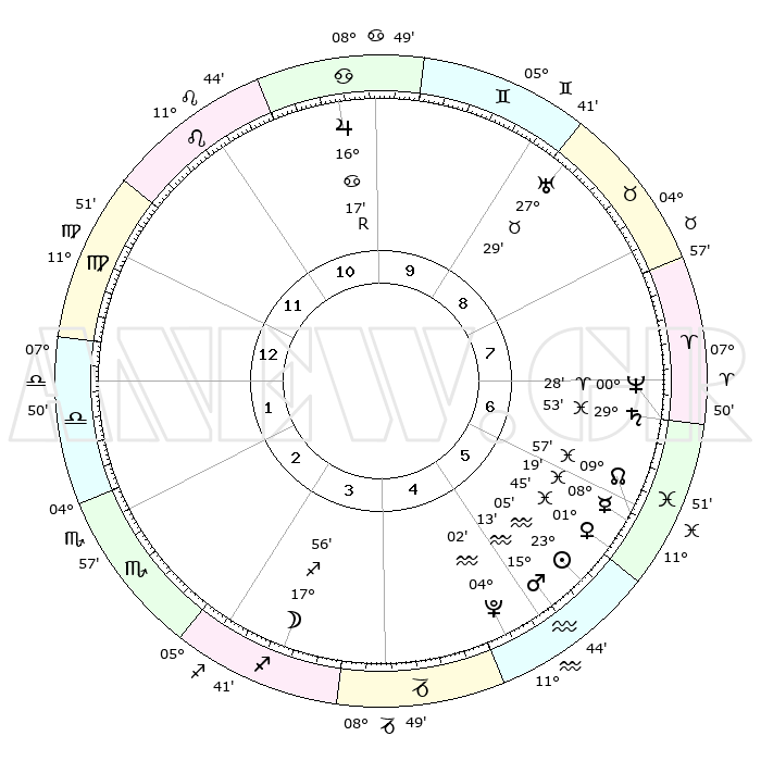 | | ΘΕΣΕΙΣ ΠΛΑΝΗΤΩΝ ΑΣΤΡΟΛΟΓΙΚΟΥ ΧΑΡΤΗ ΤΗΣ ΣΤΙΓΜΗΣ ΑΥΤΗΣ | | | | Πλανήτης | Ζώδιο | Μοίρες | Δεκαήμ. | Σε οίκο | Απόκλιση | | Ακμές των οίκων | | Ηλιος | Υδροχόος | 23°01' | Τρίτο | 6 | 13 S 50 | | 1ος | 17°22' | Παρθένος | | Σελήνη | Τοξότης | 17°07' | Δεύτερο | 4 | 27 S 59 | | 2ος | 12°56' | Ζυγός | | Ερμής | Ιχθείς | 08°13' | Πρώτο | 6 | 09 S 03 | | 3ος | 12°49' | Σκορπιός | | Αφροδίτη | Ιχθείς | 01°40' | Πρώτο | 6 | 12 S 15 | | 4ος | 15°45' | Τοξότης | | Αρης | Υδροχόος | 15°10' | Δεύτερο | 5 | 17 S 18 | | 5ος | 19°01' | Αιγόκερως | | Δίας | Καρκίνος | 16°17'R | Δεύτερο | 10 | 22 N 46 | | 6ος | 19°57' | Υδροχόος | | Κρόνος | Ιχθείς | 29°52' | Τρίτο | 7 | 02 S 02 | | 7ος | 17°22' | Ιχθείς | | Ουρανός | Ταύρος | 27°29' | Τρίτο | 9 | 19 N 25 | | 8ος | 12°56' | Κριός | | Ποσειδώνας | Κριός | 00°28' | Πρώτο | 7 | 01 S 01 | | 9ος | 12°49' | Ταύρος | | Πλούτωνας | Υδροχόος | 04°02' | Πρώτο | 5 | 22 S 58 | | 10ος | 15°45' | Δίδυμοι | | Β. Δεσμός | Ιχθείς | 09°58' | Πρώτο | 6 | 07 S 50 | | 11ος | 19°01' | Καρκίνος | | Ωροσκόπος | Παρθένος | 17°22' | Δεύτερο | | | 12ος | 19°57' | Λέων | | Μεσουράνημα | Δίδυμοι | 15°45' | Δεύτερο | | | |