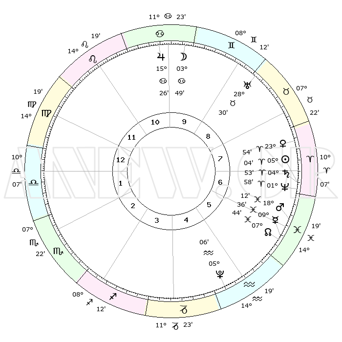 | | ΘΕΣΕΙΣ ΠΛΑΝΗΤΩΝ ΑΣΤΡΟΛΟΓΙΚΟΥ ΧΑΡΤΗ ΤΗΣ ΣΤΙΓΜΗΣ ΑΥΤΗΣ | | | | Πλανήτης | Ζώδιο | Μοίρες | Δεκαήμ. | Σε οίκο | Απόκλιση | | Ακμές των οίκων | | Ηλιος | Κριός | 04°60' | Πρώτο | 7 | 01 N 59 | | 1ος | 20°03' | Παρθένος | | Σελήνη | Καρκίνος | 02°51' | Πρώτο | 10 | 28 N 10 | | 2ος | 15°51' | Ζυγός | | Ερμής | Ιχθείς | 09°34' | Πρώτο | 6 | 08 S 06 | | 3ος | 15°52' | Σκορπιός | | Αφροδίτη | Κριός | 23°49' | Τρίτο | 8 | 08 N 36 | | 4ος | 18°48' | Τοξότης | | Αρης | Ιχθείς | 18°09' | Δεύτερο | 6 | 05 S 40 | | 5ος | 21°59' | Αιγόκερως | | Δίας | Καρκίνος | 15°26' | Δεύτερο | 10 | 22 N 54 | | 6ος | 22°48' | Υδροχόος | | Κρόνος | Κριός | 04°52' | Πρώτο | 7 | 00 S 01 | | 7ος | 20°03' | Ιχθείς | | Ουρανός | Ταύρος | 28°30' | Τρίτο | 9 | 19 N 39 | | 8ος | 15°51' | Κριός | | Ποσειδώνας | Κριός | 01°58' | Πρώτο | 7 | 00 S 25 | | 9ος | 15°52' | Ταύρος | | Πλούτωνας | Υδροχόος | 05°06' | Πρώτο | 5 | 22 S 48 | | 10ος | 18°48' | Δίδυμοι | | Β. Δεσμός | Ιχθείς | 07°44' | Πρώτο | 6 | 08 S 40 | | 11ος | 21°58' | Καρκίνος | | Ωροσκόπος | Παρθένος | 20°03' | Τρίτο | | | 12ος | 22°48' | Λέων | | Μεσουράνημα | Δίδυμοι | 18°48' | Δεύτερο | | | |