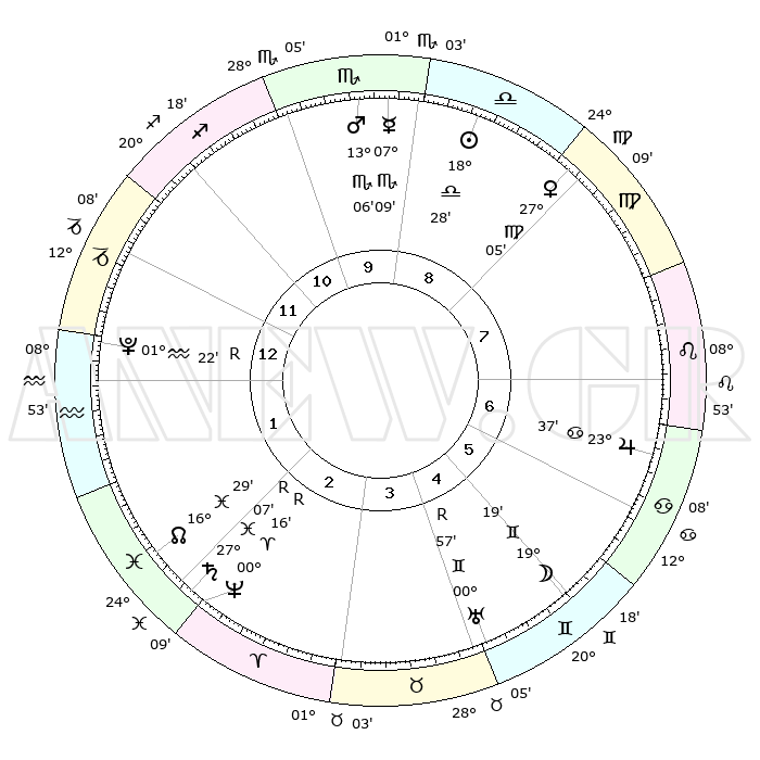 | ΘΕΣΕΙΣ ΠΛΑΝΗΤΩΝ ΑΣΤΡΟΛΟΓΙΚΟΥ ΧΑΡΤΗ ΤΗΣ ΣΤΙΓΜΗΣ ΑΥΤΗΣ | | Πλανήτης | Ζώδιο | Μοίρες | Δεκαήμ. | Σε οίκο | Απόκλιση | | Ακμές των οίκων | Ηλιος | Ζυγός | 18°16' | Δεύτερο | 11 | 07 S 10 | | 1ος | 29°31' | Σκορπιός | Σελήνη | Δίδυμοι | 16°25' | Δεύτερο | 7 | 27 N 55 | | 2ος | 00°35' | Αιγόκερως | Ερμής | Σκορπιός | 06°52' | Πρώτο | 11 | 15 S 03 | | 3ος | 06°13' | Υδροχόος | Αφροδίτη | Παρθένος | 26°51' | Τρίτο | 10 | 02 N 37 | | 4ος | 12°15' | Ιχθείς | Αρης | Σκορπιός | 12°58' | Δεύτερο | 12 | 15 S 54 | | 5ος | 13°20' | Κριός | Δίας | Καρκίνος | 23°36' | Τρίτο | 8 | 21 N 25 | | 6ος | 08°27' | Ταύρος | Κρόνος | Ιχθείς | 27°08'R | Τρίτο | 4 | 03 S 26 | | 7ος | 29°31' | Ταύρος | Ουρανός | Δίδυμοι | 00°58'R | Πρώτο | 7 | 20 N 08 | | 8ος | 00°35' | Καρκίνος | Ποσειδώνας | Κριός | 00°16'R | Πρώτο | 4 | 01 S 09 | | 9ος | 06°13' | Λέων | Πλούτωνας | Υδροχόος | 01°22'R | Πρώτο | 2 | 23 S 32 | | 10ος | 12°15' | Παρθένος | Β. Δεσμός | Ιχθείς | 16°30' | Δεύτερο | 4 | 05 S 20 | | 11ος | 13°20' | Ζυγός | Ωροσκόπος | Σκορπιός | 29°31' | Τρίτο | | | 12ος | 08°27' | Σκορπιός | Μεσουράνημα | Παρθένος | 12°15' | Δεύτερο | | | |