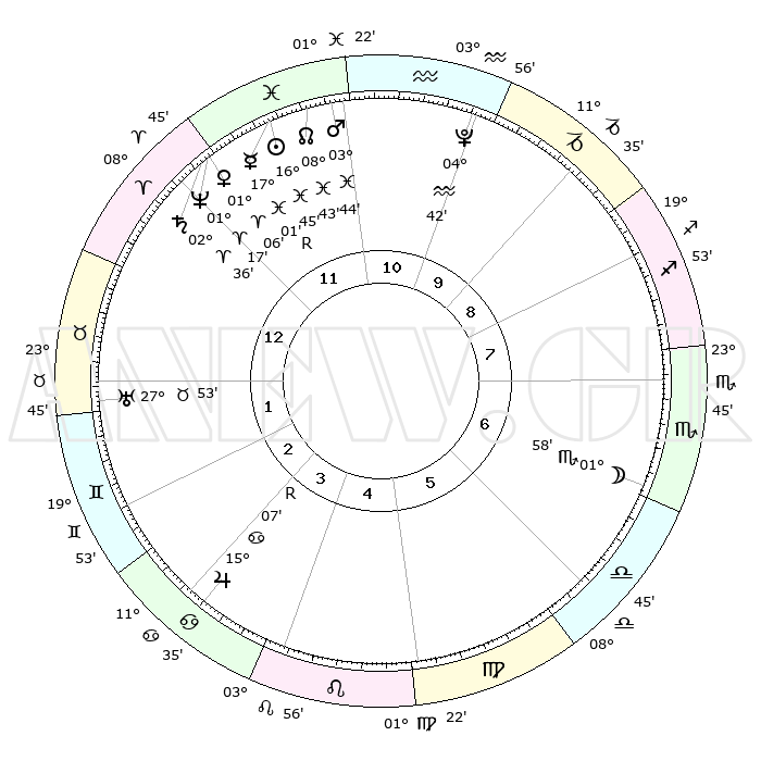 | | ΘΕΣΕΙΣ ΠΛΑΝΗΤΩΝ ΑΣΤΡΟΛΟΓΙΚΟΥ ΧΑΡΤΗ ΤΗΣ ΣΤΙΓΜΗΣ ΑΥΤΗΣ | | | | Πλανήτης | Ζώδιο | Μοίρες | Δεκαήμ. | Σε οίκο | Απόκλιση | | Ακμές των οίκων | | Ηλιος | Ιχθείς | 16°41' | Δεύτερο | 12 | 05 S 15 | | 1ος | 19°17' | Κριός | | Σελήνη | Σκορπιός | 01°08' | Πρώτο | 7 | 15 S 46 | | 2ος | 24°29' | Ταύρος | | Ερμής | Ιχθείς | 17°05'R | Δεύτερο | 12 | 01 S 44 | | 3ος | 19°14' | Δίδυμοι | | Αφροδίτη | Κριός | 01°01' | Πρώτο | 12 | 00 S 44 | | 4ος | 10°59' | Καρκίνος | | Αρης | Ιχθείς | 03°41' | Πρώτο | 11 | 11 S 10 | | 5ος | 04°27' | Λέων | | Δίας | Καρκίνος | 15°07'R | Δεύτερο | 4 | 22 N 56 | | 6ος | 05°06' | Παρθένος | | Κρόνος | Κριός | 02°36' | Πρώτο | 12 | 00 S 55 | | 7ος | 19°17' | Ζυγός | | Ουρανός | Ταύρος | 27°53' | Τρίτο | 2 | 19 N 31 | | 8ος | 24°29' | Σκορπιός | | Ποσειδώνας | Κριός | 01°17' | Πρώτο | 12 | 00 S 41 | | 9ος | 19°14' | Τοξότης | | Πλούτωνας | Υδροχόος | 04°42' | Πρώτο | 11 | 22 S 51 | | 10ος | 10°59' | Αιγόκερως | | Β. Δεσμός | Ιχθείς | 08°43' | Πρώτο | 12 | 08 S 18 | | 11ος | 04°27' | Υδροχόος | | Ωροσκόπος | Κριός | 19°17' | Δεύτερο | | | 12ος | 05°06' | Ιχθείς | | Μεσουράνημα | Αιγόκερως | 10°59' | Δεύτερο | | | |