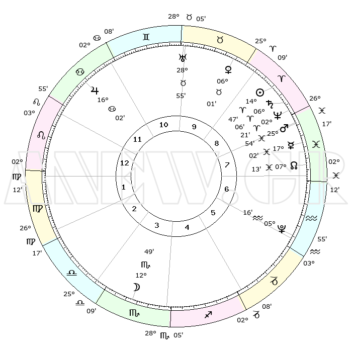 | | ΘΕΣΕΙΣ ΠΛΑΝΗΤΩΝ ΑΣΤΡΟΛΟΓΙΚΟΥ ΧΑΡΤΗ ΤΗΣ ΣΤΙΓΜΗΣ ΑΥΤΗΣ | | | | Πλανήτης | Ζώδιο | Μοίρες | Δεκαήμ. | Σε οίκο | Απόκλιση | | Ακμές των οίκων | | Ηλιος | Κριός | 14°43' | Δεύτερο | 9 | 05 N 48 | | 1ος | 11°28' | Λέων | | Σελήνη | Σκορπιός | 11°57' | Δεύτερο | 4 | 19 S 49 | | 2ος | 03°25' | Παρθένος | | Ερμής | Ιχθείς | 16°57' | Δεύτερο | 8 | 06 S 48 | | 3ος | 00°01' | Ζυγός | | Αφροδίτη | Ταύρος | 05°56' | Πρώτο | 10 | 13 N 13 | | 4ος | 02°12' | Σκορπιός | | Αρης | Ιχθείς | 25°51' | Τρίτο | 8 | 02 S 36 | | 5ος | 07°42' | Τοξότης | | Δίας | Καρκίνος | 16°02' | Δεύτερο | 12 | 22 N 51 | | 6ος | 11°40' | Αιγόκερως | | Κρόνος | Κριός | 06°06' | Πρώτο | 9 | 00 N 28 | | 7ος | 11°28' | Υδροχόος | | Ουρανός | Ταύρος | 28°55' | Τρίτο | 10 | 19 N 45 | | 8ος | 03°25' | Ιχθείς | | Ποσειδώνας | Κριός | 02°20' | Πρώτο | 9 | 00 S 16 | | 9ος | 00°01' | Κριός | | Πλούτωνας | Υδροχόος | 05°16' | Πρώτο | 6 | 22 S 47 | | 10ος | 02°12' | Ταύρος | | Β. Δεσμός | Ιχθείς | 07°13' | Πρώτο | 8 | 08 S 51 | | 11ος | 07°42' | Δίδυμοι | | Ωροσκόπος | Λέων | 11°28' | Δεύτερο | | | 12ος | 11°40' | Καρκίνος | | Μεσουράνημα | Ταύρος | 02°12' | Πρώτο | | | |