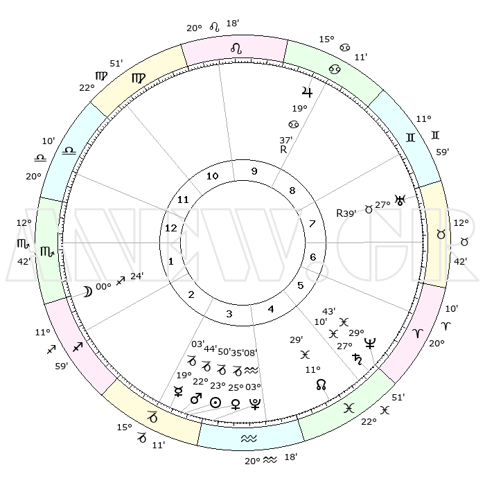 | | ΘΕΣΕΙΣ ΠΛΑΝΗΤΩΝ ΑΣΤΡΟΛΟΓΙΚΟΥ ΧΑΡΤΗ ΤΗΣ ΣΤΙΓΜΗΣ ΑΥΤΗΣ | | | | Πλανήτης | Ζώδιο | Μοίρες | Δεκαήμ. | Σε οίκο | Απόκλιση | | Ακμές των οίκων | | Ηλιος | Αιγόκερως | 23°45' | Τρίτο | 4 | 21 S 21 | | 1ος | 20°04' | Ζυγός | | Σελήνη | Σκορπιός | 29°28' | Τρίτο | 2 | 24 S 57 | | 2ος | 17°55' | Σκορπιός | | Ερμής | Αιγόκερως | 18°56' | Δεύτερο | 3 | 23 S 48 | | 3ος | 19°13' | Τοξότης | | Αφροδίτη | Αιγόκερως | 25°30' | Τρίτο | 4 | 21 S 58 | | 4ος | 22°48' | Αιγόκερως | | Αρης | Αιγόκερως | 22°40' | Τρίτο | 3 | 22 S 29 | | 5ος | 25°46' | Υδροχόος | | Δίας | Καρκίνος | 19°37'R | Δεύτερο | 9 | 22 N 16 | | 6ος | 25°12' | Ιχθείς | | Κρόνος | Ιχθείς | 27°10' | Τρίτο | 6 | 03 S 10 | | 7ος | 20°04' | Κριός | | Ουρανός | Ταύρος | 27°39'R | Τρίτο | 8 | 19 N 26 | | 8ος | 17°55' | Ταύρος | | Ποσειδώνας | Ιχθείς | 29°43' | Τρίτο | 6 | 01 S 20 | | 9ος | 19°13' | Δίδυμοι | | Πλούτωνας | Υδροχόος | 03°07' | Πρώτο | 4 | 23 S 08 | | 10ος | 22°48' | Καρκίνος | | Β. Δεσμός | Ιχθείς | 11°29' | Δεύτερο | 5 | 07 S 15 | | 11ος | 25°46' | Λέων | | Ωροσκόπος | Ζυγός | 20°04' | Τρίτο | | | 12ος | 25°12' | Παρθένος | | Μεσουράνημα | Καρκίνος | 22°48' | Τρίτο | | | |