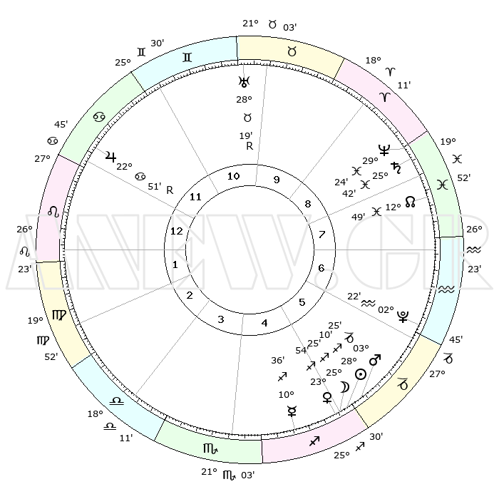 | | ΘΕΣΕΙΣ ΠΛΑΝΗΤΩΝ ΑΣΤΡΟΛΟΓΙΚΟΥ ΧΑΡΤΗ ΤΗΣ ΣΤΙΓΜΗΣ ΑΥΤΗΣ | | | | Πλανήτης | Ζώδιο | Μοίρες | Δεκαήμ. | Σε οίκο | Απόκλιση | | Ακμές των οίκων | | Ηλιος | Τοξότης | 28°05' | Τρίτο | 5 | 23 S 25 | | 1ος | 05°28' | Λέων | | Σελήνη | Τοξότης | 24°33' | Τρίτο | 5 | 28 S 12 | | 2ος | 26°54' | Λέων | | Ερμής | Τοξότης | 10°30' | Δεύτερο | 5 | 21 S 06 | | 3ος | 22°42' | Παρθένος | | Αφροδίτη | Τοξότης | 23°48' | Τρίτο | 5 | 23 S 19 | | 4ος | 24°21' | Ζυγός | | Αρης | Αιγόκερως | 03°22' | Πρώτο | 5 | 24 S 12 | | 5ος | 00°12' | Τοξότης | | Δίας | Καρκίνος | 22°51'R | Τρίτο | 12 | 21 N 42 | | 6ος | 05°02' | Αιγόκερως | | Κρόνος | Ιχθείς | 25°42' | Τρίτο | 9 | 03 S 49 | | 7ος | 05°28' | Υδροχόος | | Ουρανός | Ταύρος | 28°20'R | Τρίτο | 10 | 19 N 35 | | 8ος | 26°54' | Υδροχόος | | Ποσειδώνας | Ιχθείς | 29°24' | Τρίτο | 9 | 01 S 28 | | 9ος | 22°42' | Ιχθείς | | Πλούτωνας | Υδροχόος | 02°22' | Πρώτο | 6 | 23 S 18 | | 10ος | 24°21' | Κριός | | Β. Δεσμός | Ιχθείς | 12°49' | Δεύτερο | 8 | 06 S 45 | | 11ος | 00°12' | Δίδυμοι | | Ωροσκόπος | Λέων | 05°28' | Πρώτο | | | 12ος | 05°02' | Καρκίνος | | Μεσουράνημα | Κριός | 24°21' | Τρίτο | | | |