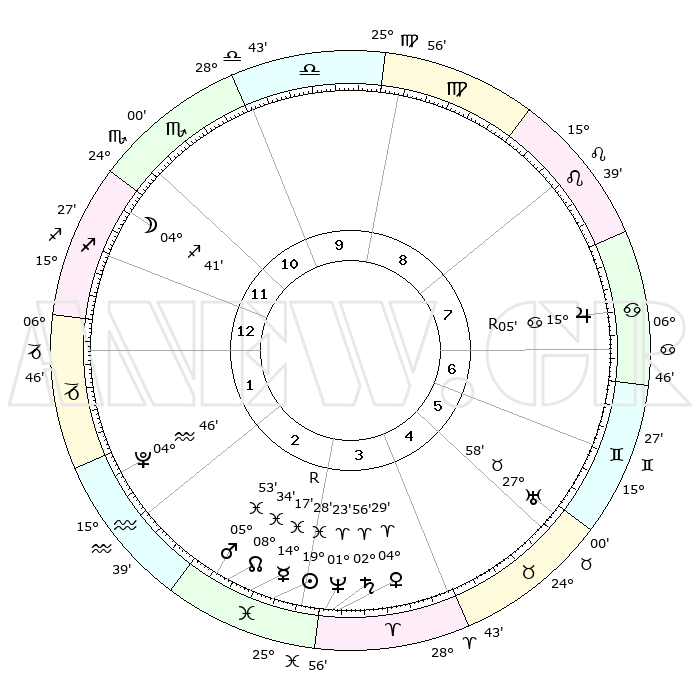 | | ΘΕΣΕΙΣ ΠΛΑΝΗΤΩΝ ΑΣΤΡΟΛΟΓΙΚΟΥ ΧΑΡΤΗ ΤΗΣ ΣΤΙΓΜΗΣ ΑΥΤΗΣ | | | | Πλανήτης | Ζώδιο | Μοίρες | Δεκαήμ. | Σε οίκο | Απόκλιση | | Ακμές των οίκων | | Ηλιος | Ιχθείς | 19°25' | Δεύτερο | 3 | 04 S 11 | | 1ος | 17°19' | Τοξότης | | Σελήνη | Τοξότης | 03°58' | Πρώτο | 12 | 26 S 06 | | 2ος | 21°30' | Αιγόκερως | | Ερμής | Ιχθείς | 14°20'R | Δεύτερο | 3 | 03 S 02 | | 3ος | 00°03' | Ιχθείς | | Αφροδίτη | Κριός | 04°24' | Πρώτο | 3 | 00 N 40 | | 4ος | 05°35' | Κριός | | Αρης | Ιχθείς | 05°50' | Πρώτο | 3 | 10 S 23 | | 5ος | 04°00' | Ταύρος | | Δίας | Καρκίνος | 15°05'R | Δεύτερο | 7 | 22 N 56 | | 6ος | 26°54' | Ταύρος | | Κρόνος | Κριός | 02°56' | Πρώτο | 3 | 00 S 47 | | 7ος | 17°19' | Δίδυμοι | | Ουρανός | Ταύρος | 27°58' | Τρίτο | 6 | 19 N 32 | | 8ος | 21°30' | Καρκίνος | | Ποσειδώνας | Κριός | 01°23' | Πρώτο | 3 | 00 S 39 | | 9ος | 00°03' | Παρθένος | | Πλούτωνας | Υδροχόος | 04°46' | Πρώτο | 2 | 22 S 50 | | 10ος | 05°35' | Ζυγός | | Β. Δεσμός | Ιχθείς | 08°34' | Πρώτο | 3 | 08 S 21 | | 11ος | 04°00' | Σκορπιός | | Ωροσκόπος | Τοξότης | 17°19' | Δεύτερο | | | 12ος | 26°54' | Σκορπιός | | Μεσουράνημα | Ζυγός | 05°35' | Πρώτο | | | |