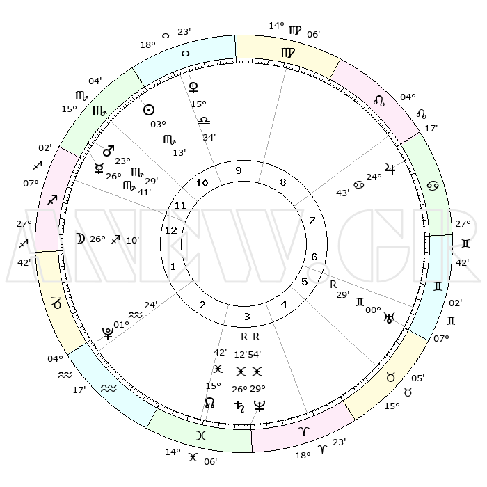 | | ΘΕΣΕΙΣ ΠΛΑΝΗΤΩΝ ΑΣΤΡΟΛΟΓΙΚΟΥ ΧΑΡΤΗ ΤΗΣ ΣΤΙΓΜΗΣ ΑΥΤΗΣ | | | | Πλανήτης | Ζώδιο | Μοίρες | Δεκαήμ. | Σε οίκο | Απόκλιση | | Ακμές των οίκων | | Ηλιος | Σκορπιός | 03°07' | Πρώτο | 11 | 12 S 33 | | 1ος | 29°19' | Σκορπιός | | Σελήνη | Τοξότης | 25°04' | Τρίτο | 1 | 28 S 25 | | 2ος | 00°21' | Αιγόκερως | | Ερμής | Σκορπιός | 26°34' | Τρίτο | 12 | 22 S 01 | | 3ος | 05°56' | Υδροχόος | | Αφροδίτη | Ζυγός | 15°27' | Δεύτερο | 11 | 04 S 40 | | 4ος | 11°58' | Ιχθείς | | Αρης | Σκορπιός | 23°26' | Τρίτο | 12 | 18 S 57 | | 5ος | 13°05' | Κριός | | Δίας | Καρκίνος | 24°43' | Τρίτο | 8 | 21 N 15 | | 6ος | 08°14' | Ταύρος | | Κρόνος | Ιχθείς | 26°12'R | Τρίτο | 4 | 03 S 47 | | 7ος | 29°19' | Ταύρος | | Ουρανός | Δίδυμοι | 00°29'R | Πρώτο | 7 | 20 N 02 | | 8ος | 00°21' | Καρκίνος | | Ποσειδώνας | Ιχθείς | 29°54'R | Τρίτο | 4 | 01 S 18 | | 9ος | 05°56' | Λέων | | Πλούτωνας | Υδροχόος | 01°24' | Πρώτο | 2 | 23 S 31 | | 10ος | 11°58' | Παρθένος | | Β. Δεσμός | Ιχθείς | 15°42' | Δεύτερο | 4 | 05 S 38 | | 11ος | 13°05' | Ζυγός | | Ωροσκόπος | Σκορπιός | 29°19' | Τρίτο | | | 12ος | 08°14' | Σκορπιός | | Μεσουράνημα | Παρθένος | 11°58' | Δεύτερο | | | |