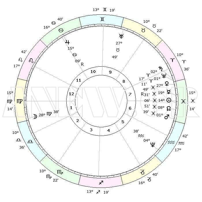 | | ΘΕΣΕΙΣ ΠΛΑΝΗΤΩΝ ΑΣΤΡΟΛΟΓΙΚΟΥ ΧΑΡΤΗ ΤΗΣ ΣΤΙΓΜΗΣ ΑΥΤΗΣ | | | | Πλανήτης | Ζώδιο | Μοίρες | Δεκαήμ. | Σε οίκο | Απόκλιση | | Ακμές των οίκων | | Ηλιος | Ιχθείς | 14°03' | Δεύτερο | 7 | 06 S 16 | | 1ος | 28°35' | Λέων | | Σελήνη | Παρθένος | 27°53' | Τρίτο | 2 | 00 S 44 | | 2ος | 22°17' | Παρθένος | | Ερμής | Ιχθείς | 19°34'R | Δεύτερο | 7 | 00 S 45 | | 3ος | 20°50' | Ζυγός | | Αφροδίτη | Ιχθείς | 27°44' | Τρίτο | 8 | 02 S 05 | | 4ος | 23°44' | Σκορπιός | | Αρης | Ιχθείς | 01°37' | Πρώτο | 7 | 11 S 55 | | 5ος | 28°01' | Τοξότης | | Δίας | Καρκίνος | 15°09'R | Δεύτερο | 11 | 22 N 55 | | 6ος | 00°05' | Υδροχόος | | Κρόνος | Κριός | 02°16' | Πρώτο | 8 | 01 S 03 | | 7ος | 28°35' | Υδροχόος | | Ουρανός | Ταύρος | 27°49' | Τρίτο | 10 | 19 N 30 | | 8ος | 22°17' | Ιχθείς | | Ποσειδώνας | Κριός | 01°11' | Πρώτο | 8 | 00 S 44 | | 9ος | 20°50' | Κριός | | Πλούτωνας | Υδροχόος | 04°38' | Πρώτο | 6 | 22 S 52 | | 10ος | 23°44' | Ταύρος | | Β. Δεσμός | Ιχθείς | 08°51' | Πρώτο | 7 | 08 S 15 | | 11ος | 28°01' | Δίδυμοι | | Ωροσκόπος | Λέων | 28°35' | Τρίτο | | | 12ος | 00°05' | Λέων | | Μεσουράνημα | Ταύρος | 23°44' | Τρίτο | | | |