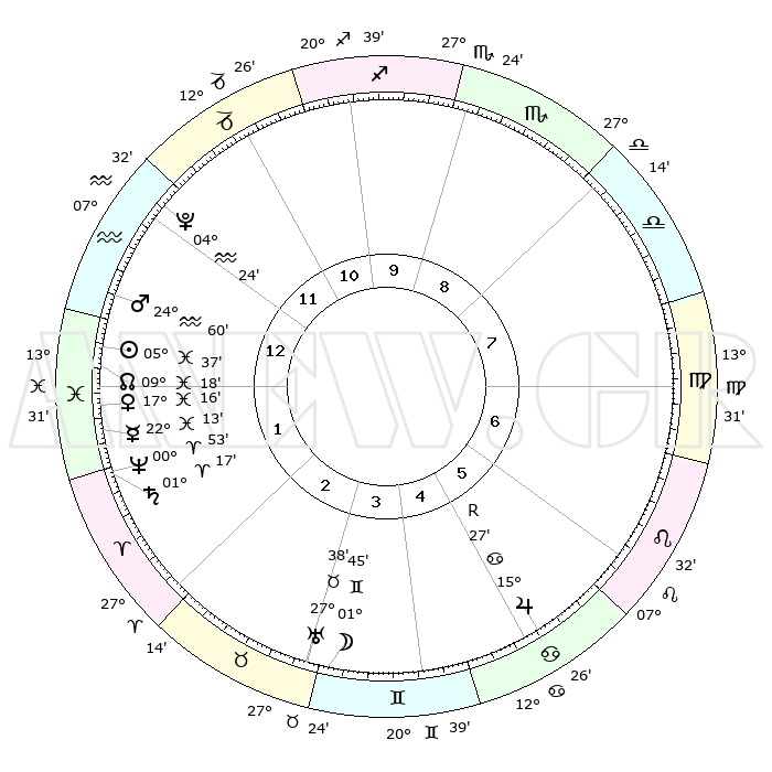 | | ΘΕΣΕΙΣ ΠΛΑΝΗΤΩΝ ΑΣΤΡΟΛΟΓΙΚΟΥ ΧΑΡΤΗ ΤΗΣ ΣΤΙΓΜΗΣ ΑΥΤΗΣ | | | | Πλανήτης | Ζώδιο | Μοίρες | Δεκαήμ. | Σε οίκο | Απόκλιση | | Ακμές των οίκων | | Ηλιος | Ιχθείς | 05°34' | Πρώτο | 1 | 09 S 28 | | 1ος | 14°42' | Υδροχόος | | Σελήνη | Δίδυμοι | 00°59' | Πρώτο | 3 | 25 N 28 | | 2ος | 00°23' | Κριός | | Ερμής | Ιχθείς | 22°12' | Τρίτο | 1 | 00 S 59 | | 3ος | 06°09' | Ταύρος | | Αφροδίτη | Ιχθείς | 17°12' | Δεύτερο | 1 | 06 S 22 | | 4ος | 02°21' | Δίδυμοι | | Αρης | Υδροχόος | 24°57' | Τρίτο | 1 | 14 S 14 | | 5ος | 24°19' | Δίδυμοι | | Δίας | Καρκίνος | 15°27'R | Δεύτερο | 5 | 22 N 53 | | 6ος | 16°32' | Καρκίνος | | Κρόνος | Κριός | 01°16' | Πρώτο | 2 | 01 S 27 | | 7ος | 14°42' | Λέων | | Ουρανός | Ταύρος | 27°38' | Τρίτο | 3 | 19 N 27 | | 8ος | 00°23' | Ζυγός | | Ποσειδώνας | Κριός | 00°53' | Πρώτο | 2 | 00 S 51 | | 9ος | 06°09' | Σκορπιός | | Πλούτωνας | Υδροχόος | 04°24' | Πρώτο | 12 | 22 S 54 | | 10ος | 02°21' | Τοξότης | | Β. Δεσμός | Ιχθείς | 09°18' | Πρώτο | 1 | 08 S 05 | | 11ος | 24°19' | Τοξότης | | Ωροσκόπος | Υδροχόος | 14°42' | Δεύτερο | | | 12ος | 16°32' | Αιγόκερως | | Μεσουράνημα | Τοξότης | 02°21' | Πρώτο | | | |