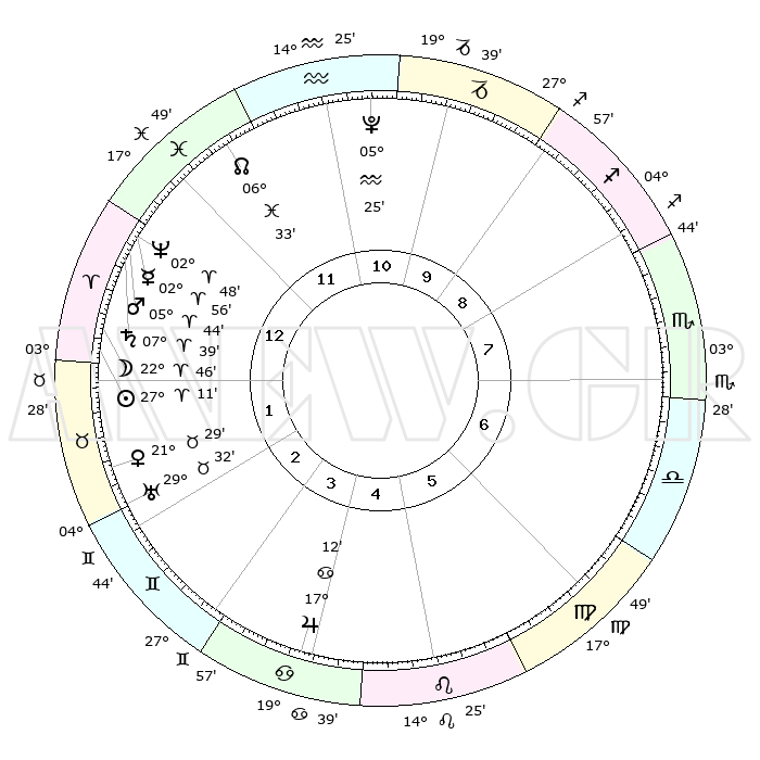 | | ΘΕΣΕΙΣ ΠΛΑΝΗΤΩΝ ΑΣΤΡΟΛΟΓΙΚΟΥ ΧΑΡΤΗ ΤΗΣ ΣΤΙΓΜΗΣ ΑΥΤΗΣ | | | | Πλανήτης | Ζώδιο | Μοίρες | Δεκαήμ. | Σε οίκο | Απόκλιση | | Ακμές των οίκων | | Ηλιος | Κριός | 27°05' | Τρίτο | 2 | 10 N 26 | | 1ος | 08°10' | Ιχθείς | | Σελήνη | Κριός | 21°22' | Τρίτο | 1 | 11 N 36 | | 2ος | 22°42' | Κριός | | Ερμής | Κριός | 02°47' | Πρώτο | 1 | 01 S 18 | | 3ος | 23°51' | Ταύρος | | Αφροδίτη | Ταύρος | 21°22' | Τρίτο | 2 | 18 N 21 | | 4ος | 17°31' | Δίδυμοι | | Αρης | Κριός | 05°39' | Πρώτο | 1 | 01 N 21 | | 5ος | 09°13' | Καρκίνος | | Δίας | Καρκίνος | 17°11' | Δεύτερο | 5 | 22 N 42 | | 6ος | 03°40' | Λέων | | Κρόνος | Κριός | 07°38' | Πρώτο | 1 | 01 N 03 | | 7ος | 08°10' | Παρθένος | | Ουρανός | Ταύρος | 29°32' | Τρίτο | 3 | 19 N 53 | | 8ος | 22°42' | Ζυγός | | Ποσειδώνας | Κριός | 02°48' | Πρώτο | 1 | 00 S 06 | | 9ος | 23°51' | Σκορπιός | | Πλούτωνας | Υδροχόος | 05°25' | Πρώτο | 12 | 22 S 47 | | 10ος | 17°31' | Τοξότης | | Β. Δεσμός | Ιχθείς | 06°33' | Πρώτο | 12 | 09 S 06 | | 11ος | 09°13' | Αιγόκερως | | Ωροσκόπος | Ιχθείς | 08°10' | Πρώτο | | | 12ος | 03°40' | Υδροχόος | | Μεσουράνημα | Τοξότης | 17°31' | Δεύτερο | | | |
