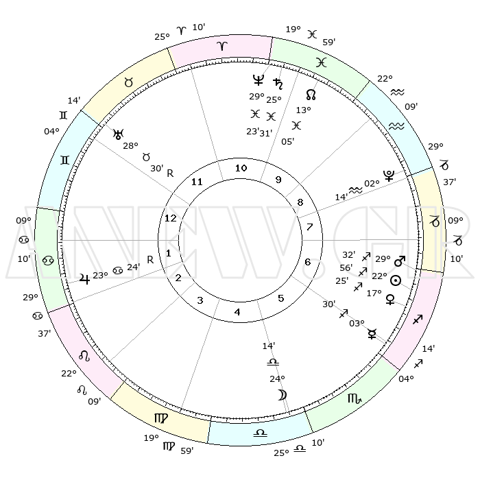 | | ΘΕΣΕΙΣ ΠΛΑΝΗΤΩΝ ΑΣΤΡΟΛΟΓΙΚΟΥ ΧΑΡΤΗ ΤΗΣ ΣΤΙΓΜΗΣ ΑΥΤΗΣ | | | | Πλανήτης | Ζώδιο | Μοίρες | Δεκαήμ. | Σε οίκο | Απόκλιση | | Ακμές των οίκων | | Ηλιος | Τοξότης | 22°39' | Τρίτο | 10 | 23 S 14 | | 1ος | 28°49' | Υδροχόος | | Σελήνη | Ζυγός | 20°55' | Τρίτο | 8 | 11 S 01 | | 2ος | 14°19' | Κριός | | Ερμής | Τοξότης | 03°08' | Πρώτο | 9 | 19 S 12 | | 3ος | 17°16' | Ταύρος | | Αφροδίτη | Τοξότης | 17°04' | Δεύτερο | 10 | 22 S 37 | | 4ος | 11°47' | Δίδυμοι | | Αρης | Τοξότης | 29°19' | Τρίτο | 10 | 24 S 12 | | 5ος | 03°29' | Καρκίνος | | Δίας | Καρκίνος | 23°26'R | Τρίτο | 5 | 21 N 36 | | 6ος | 26°55' | Καρκίνος | | Κρόνος | Ιχθείς | 25°31' | Τρίτο | 1 | 03 S 55 | | 7ος | 28°49' | Λέων | | Ουρανός | Ταύρος | 28°31'R | Τρίτο | 3 | 19 N 38 | | 8ος | 14°19' | Ζυγός | | Ποσειδώνας | Ιχθείς | 29°23' | Τρίτο | 1 | 01 S 29 | | 9ος | 17°16' | Σκορπιός | | Πλούτωνας | Υδροχόος | 02°14' | Πρώτο | 12 | 23 S 20 | | 10ος | 11°47' | Τοξότης | | Β. Δεσμός | Ιχθείς | 13°06' | Δεύτερο | 1 | 06 S 38 | | 11ος | 03°29' | Αιγόκερως | | Ωροσκόπος | Υδροχόος | 28°49' | Τρίτο | | | 12ος | 26°55' | Αιγόκερως | | Μεσουράνημα | Τοξότης | 11°47' | Δεύτερο | | | |