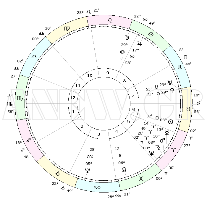 | | ΘΕΣΕΙΣ ΠΛΑΝΗΤΩΝ ΑΣΤΡΟΛΟΓΙΚΟΥ ΧΑΡΤΗ ΤΗΣ ΣΤΙΓΜΗΣ ΑΥΤΗΣ | | | | Πλανήτης | Ζώδιο | Μοίρες | Δεκαήμ. | Σε οίκο | Απόκλιση | | Ακμές των οίκων | | Ηλιος | Ταύρος | 03°33' | Πρώτο | 7 | 12 N 42 | | 1ος | 00°15' | Σκορπιός | | Σελήνη | Καρκίνος | 28°20' | Τρίτο | 9 | 23 N 38 | | 2ος | 28°41' | Σκορπιός | | Ερμής | Κριός | 13°08' | Δεύτερο | 6 | 02 N 53 | | 3ος | 00°39' | Αιγόκερως | | Αφροδίτη | Ταύρος | 29°26' | Τρίτο | 8 | 20 N 35 | | 4ος | 04°51' | Υδροχόος | | Αρης | Κριός | 10°46' | Δεύτερο | 6 | 03 N 24 | | 5ος | 07°46' | Ιχθείς | | Δίας | Καρκίνος | 17°57' | Δεύτερο | 9 | 22 N 37 | | 6ος | 06°25' | Κριός | | Κρόνος | Κριός | 08°25' | Πρώτο | 6 | 01 N 21 | | 7ος | 00°15' | Ταύρος | | Ουρανός | Ταύρος | 29°53' | Τρίτο | 8 | 19 N 57 | | 8ος | 28°41' | Ταύρος | | Ποσειδώνας | Κριός | 03°01' | Πρώτο | 5 | 00 S 00 | | 9ος | 00°39' | Καρκίνος | | Πλούτωνας | Υδροχόος | 05°28' | Πρώτο | 4 | 22 S 48 | | 10ος | 04°51' | Λέων | | Β. Δεσμός | Ιχθείς | 06°12' | Πρώτο | 4 | 09 S 14 | | 11ος | 07°46' | Παρθένος | | Ωροσκόπος | Σκορπιός | 00°15' | Πρώτο | | | 12ος | 06°25' | Ζυγός | | Μεσουράνημα | Λέων | 04°51' | Πρώτο | | | |