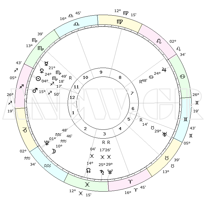 | | ΘΕΣΕΙΣ ΠΛΑΝΗΤΩΝ ΑΣΤΡΟΛΟΓΙΚΟΥ ΧΑΡΤΗ ΤΗΣ ΣΤΙΓΜΗΣ ΑΥΤΗΣ | | | | Πλανήτης | Ζώδιο | Μοίρες | Δεκαήμ. | Σε οίκο | Απόκλιση | | Ακμές των οίκων | | Ηλιος | Τοξότης | 04°16' | Πρώτο | 12 | 21 S 00 | | 1ος | 23°39' | Τοξότης | | Σελήνη | Υδροχόος | 10°40' | Δεύτερο | 2 | 20 S 15 | | 2ος | 29°15' | Αιγόκερως | | Ερμής | Σκορπιός | 21°49'R | Τρίτο | 11 | 16 S 09 | | 3ος | 08°39' | Ιχθείς | | Αφροδίτη | Σκορπιός | 24°17' | Τρίτο | 11 | 18 S 00 | | 4ος | 13°30' | Κριός | | Αρης | Τοξότης | 15°49' | Δεύτερο | 12 | 23 S 18 | | 5ος | 10°51' | Ταύρος | | Δίας | Καρκίνος | 24°48'R | Τρίτο | 7 | 21 N 18 | | 6ος | 03°08' | Δίδυμοι | | Κρόνος | Ιχθείς | 25°17'R | Τρίτο | 3 | 04 S 04 | | 7ος | 23°39' | Δίδυμοι | | Ουρανός | Ταύρος | 29°14'R | Τρίτο | 5 | 19 N 47 | | 8ος | 29°15' | Καρκίνος | | Ποσειδώνας | Ιχθείς | 29°26'R | Τρίτο | 3 | 01 S 28 | | 9ος | 08°39' | Παρθένος | | Πλούτωνας | Υδροχόος | 01°48' | Πρώτο | 2 | 23 S 25 | | 10ος | 13°30' | Ζυγός | | Β. Δεσμός | Ιχθείς | 14°04' | Δεύτερο | 3 | 06 S 16 | | 11ος | 10°51' | Σκορπιός | | Ωροσκόπος | Τοξότης | 23°39' | Τρίτο | | | 12ος | 03°08' | Τοξότης | | Μεσουράνημα | Ζυγός | 13°30' | Δεύτερο | | | |