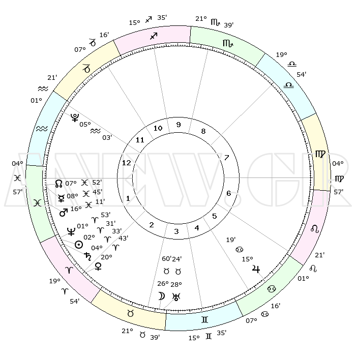 | | ΘΕΣΕΙΣ ΠΛΑΝΗΤΩΝ ΑΣΤΡΟΛΟΓΙΚΟΥ ΧΑΡΤΗ ΤΗΣ ΣΤΙΓΜΗΣ ΑΥΤΗΣ | | | | Πλανήτης | Ζώδιο | Μοίρες | Δεκαήμ. | Σε οίκο | Απόκλιση | | Ακμές των οίκων | | Ηλιος | Κριός | 02°26' | Πρώτο | 2 | 00 N 58 | | 1ος | 28°11' | Αιγόκερως | | Σελήνη | Ταύρος | 25°54' | Τρίτο | 4 | 24 N 11 | | 2ος | 11°58' | Ιχθείς | | Ερμής | Ιχθείς | 08°44' | Πρώτο | 1 | 07 S 53 | | 3ος | 20°41' | Κριός | | Αφροδίτη | Κριός | 20°38' | Τρίτο | 2 | 07 N 19 | | 4ος | 19°28' | Ταύρος | | Αρης | Ιχθείς | 16°07' | Δεύτερο | 2 | 06 S 28 | | 5ος | 12°22' | Δίδυμοι | | Δίας | Καρκίνος | 15°19' | Δεύτερο | 6 | 22 N 55 | | 6ος | 03°44' | Καρκίνος | | Κρόνος | Κριός | 04°33' | Πρώτο | 2 | 00 S 09 | | 7ος | 28°11' | Καρκίνος | | Ουρανός | Ταύρος | 28°24' | Τρίτο | 4 | 19 N 38 | | 8ος | 11°58' | Παρθένος | | Ποσειδώνας | Κριός | 01°52' | Πρώτο | 2 | 00 S 27 | | 9ος | 20°41' | Ζυγός | | Πλούτωνας | Υδροχόος | 05°03' | Πρώτο | 1 | 22 S 48 | | 10ος | 19°28' | Σκορπιός | | Β. Δεσμός | Ιχθείς | 07°53' | Πρώτο | 1 | 08 S 37 | | 11ος | 12°22' | Τοξότης | | Ωροσκόπος | Αιγόκερως | 28°11' | Τρίτο | | | 12ος | 03°44' | Αιγόκερως | | Μεσουράνημα | Σκορπιός | 19°28' | Δεύτερο | | | |