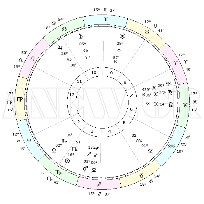| | ΘΕΣΕΙΣ ΠΛΑΝΗΤΩΝ ΑΣΤΡΟΛΟΓΙΚΟΥ ΧΑΡΤΗ ΤΗΣ ΣΤΙΓΜΗΣ ΑΥΤΗΣ | | | | Πλανήτης | Ζώδιο | Μοίρες | Δεκαήμ. | Σε οίκο | Απόκλιση | | Ακμές των οίκων | | Ηλιος | Σκορπιός | 16°46' | Δεύτερο | 3 | 16 S 51 | | 1ος | 25°45' | Λέων | | Σελήνη | Καρκίνος | 04°26' | Πρώτο | 11 | 28 N 11 | | 2ος | 19°09' | Παρθένος | | Ερμής | Τοξότης | 06°48' | Πρώτο | 4 | 23 S 53 | | 3ος | 17°25' | Ζυγός | | Αφροδίτη | Σκορπιός | 02°30' | Πρώτο | 3 | 11 S 04 | | 4ος | 20°15' | Σκορπιός | | Αρης | Τοξότης | 03°10' | Πρώτο | 4 | 21 S 15 | | 5ος | 24°45' | Τοξότης | | Δίας | Καρκίνος | 25°08' | Τρίτο | 11 | 21 N 12 | | 6ος | 27°04' | Αιγόκερως | | Κρόνος | Ιχθείς | 25°37'R | Τρίτο | 8 | 03 S 59 | | 7ος | 25°45' | Υδροχόος | | Ουρανός | Ταύρος | 29°58'R | Τρίτο | 10 | 19 N 56 | | 8ος | 19°09' | Ιχθείς | | Ποσειδώνας | Ιχθείς | 29°39'R | Τρίτο | 8 | 01 S 24 | | 9ος | 17°25' | Κριός | | Πλούτωνας | Υδροχόος | 01°32' | Πρώτο | 6 | 23 S 29 | | 10ος | 20°15' | Ταύρος | | Β. Δεσμός | Ιχθείς | 14°59' | Δεύτερο | 7 | 05 S 55 | | 11ος | 24°45' | Δίδυμοι | | Ωροσκόπος | Λέων | 25°45' | Τρίτο | | | 12ος | 27°04' | Καρκίνος | | Μεσουράνημα | Ταύρος | 20°15' | Τρίτο | | | |