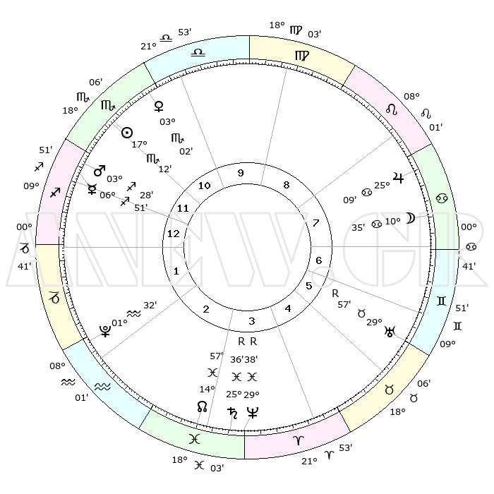 | | ΘΕΣΕΙΣ ΠΛΑΝΗΤΩΝ ΑΣΤΡΟΛΟΓΙΚΟΥ ΧΑΡΤΗ ΤΗΣ ΣΤΙΓΜΗΣ ΑΥΤΗΣ | | | | Πλανήτης | Ζώδιο | Μοίρες | Δεκαήμ. | Σε οίκο | Απόκλιση | | Ακμές των οίκων | | Ηλιος | Σκορπιός | 17°07' | Δεύτερο | 12 | 16 S 56 | | 1ος | 06°04' | Τοξότης | | Σελήνη | Καρκίνος | 09°26' | Πρώτο | 8 | 27 N 45 | | 2ος | 08°06' | Αιγόκερως | | Ερμής | Τοξότης | 06°51' | Πρώτο | 1 | 23 S 50 | | 3ος | 14°50' | Υδροχόος | | Αφροδίτη | Σκορπιός | 02°56' | Πρώτο | 11 | 11 S 14 | | 4ος | 20°55' | Ιχθείς | | Αρης | Τοξότης | 03°25' | Πρώτο | 12 | 21 S 18 | | 5ος | 21°08' | Κριός | | Δίας | Καρκίνος | 25°09' | Τρίτο | 8 | 21 N 12 | | 6ος | 15°22' | Ταύρος | | Κρόνος | Ιχθείς | 25°36'R | Τρίτο | 4 | 03 S 59 | | 7ος | 06°04' | Δίδυμοι | | Ουρανός | Ταύρος | 29°57'R | Τρίτο | 6 | 19 N 56 | | 8ος | 08°06' | Καρκίνος | | Ποσειδώνας | Ιχθείς | 29°38'R | Τρίτο | 4 | 01 S 24 | | 9ος | 14°50' | Λέων | | Πλούτωνας | Υδροχόος | 01°32' | Πρώτο | 2 | 23 S 29 | | 10ος | 20°55' | Παρθένος | | Β. Δεσμός | Ιχθείς | 14°58' | Δεύτερο | 3 | 05 S 55 | | 11ος | 21°08' | Ζυγός | | Ωροσκόπος | Τοξότης | 06°04' | Πρώτο | | | 12ος | 15°22' | Σκορπιός | | Μεσουράνημα | Παρθένος | 20°55' | Τρίτο | | | |