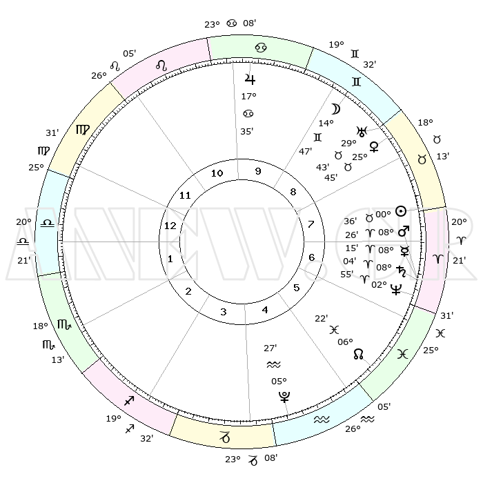 | | ΘΕΣΕΙΣ ΠΛΑΝΗΤΩΝ ΑΣΤΡΟΛΟΓΙΚΟΥ ΧΑΡΤΗ ΤΗΣ ΣΤΙΓΜΗΣ ΑΥΤΗΣ | | | | Πλανήτης | Ζώδιο | Μοίρες | Δεκαήμ. | Σε οίκο | Απόκλιση | | Ακμές των οίκων | | Ηλιος | Ταύρος | 00°32' | Πρώτο | 8 | 11 N 39 | | 1ος | 02°60' | Ζυγός | | Σελήνη | Δίδυμοι | 13°55' | Δεύτερο | 9 | 27 N 30 | | 2ος | 29°48' | Ζυγός | | Ερμής | Κριός | 08°10' | Πρώτο | 7 | 00 N 50 | | 3ος | 00°20' | Τοξότης | | Αφροδίτη | Ταύρος | 25°41' | Τρίτο | 8 | 19 N 36 | | 4ος | 03°22' | Αιγόκερως | | Αρης | Κριός | 08°23' | Πρώτο | 7 | 02 N 27 | | 5ος | 06°19' | Υδροχόος | | Δίας | Καρκίνος | 17°35' | Δεύτερο | 10 | 22 N 39 | | 6ος | 06°38' | Ιχθείς | | Κρόνος | Κριός | 08°03' | Πρώτο | 7 | 01 N 13 | | 7ος | 02°60' | Κριός | | Ουρανός | Ταύρος | 29°43' | Τρίτο | 8 | 19 N 55 | | 8ος | 29°48' | Κριός | | Ποσειδώνας | Κριός | 02°55' | Πρώτο | 6 | 00 S 03 | | 9ος | 00°20' | Δίδυμοι | | Πλούτωνας | Υδροχόος | 05°27' | Πρώτο | 4 | 22 S 48 | | 10ος | 03°22' | Καρκίνος | | Β. Δεσμός | Ιχθείς | 06°22' | Πρώτο | 5 | 09 S 10 | | 11ος | 06°19' | Λέων | | Ωροσκόπος | Ζυγός | 02°60' | Πρώτο | | | 12ος | 06°38' | Παρθένος | | Μεσουράνημα | Καρκίνος | 03°22' | Πρώτο | | | |