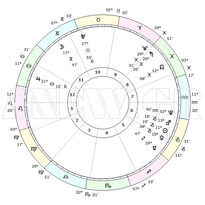 | | ΘΕΣΕΙΣ ΠΛΑΝΗΤΩΝ ΑΣΤΡΟΛΟΓΙΚΟΥ ΧΑΡΤΗ ΤΗΣ ΣΤΙΓΜΗΣ ΑΥΤΗΣ | | | | Πλανήτης | Ζώδιο | Μοίρες | Δεκαήμ. | Σε οίκο | Απόκλιση | | Ακμές των οίκων | | Ηλιος | Αιγόκερως | 11°15' | Δεύτερο | 6 | 22 S 57 | | 1ος | 19°20' | Καρκίνος | | Σελήνη | Δίδυμοι | 16°39' | Δεύτερο | 12 | 27 N 47 | | 2ος | 09°51' | Λέων | | Ερμής | Τοξότης | 29°40' | Τρίτο | 6 | 24 S 04 | | 3ος | 03°31' | Παρθένος | | Αφροδίτη | Αιγόκερως | 10°03' | Δεύτερο | 6 | 23 S 35 | | 4ος | 03°01' | Ζυγός | | Αρης | Αιγόκερως | 13°12' | Δεύτερο | 6 | 23 S 40 | | 5ος | 08°59' | Σκορπιός | | Δίας | Καρκίνος | 21°16'R | Τρίτο | 1 | 21 N 59 | | 6ος | 16°29' | Τοξότης | | Κρόνος | Ιχθείς | 26°19' | Τρίτο | 9 | 03 S 32 | | 7ος | 19°20' | Αιγόκερως | | Ουρανός | Ταύρος | 27°56'R | Τρίτο | 11 | 19 N 30 | | 8ος | 09°51' | Υδροχόος | | Ποσειδώνας | Ιχθείς | 29°31' | Τρίτο | 9 | 01 S 25 | | 9ος | 03°31' | Ιχθείς | | Πλούτωνας | Υδροχόος | 02°45' | Πρώτο | 7 | 23 S 13 | | 10ος | 03°01' | Κριός | | Β. Δεσμός | Ιχθείς | 12°08' | Δεύτερο | 9 | 07 S 00 | | 11ος | 08°59' | Ταύρος | | Ωροσκόπος | Καρκίνος | 19°20' | Δεύτερο | | | 12ος | 16°29' | Δίδυμοι | | Μεσουράνημα | Κριός | 03°01' | Πρώτο | | | |