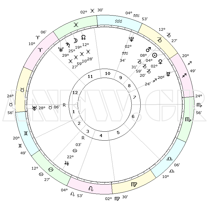 | | ΘΕΣΕΙΣ ΠΛΑΝΗΤΩΝ ΑΣΤΡΟΛΟΓΙΚΟΥ ΧΑΡΤΗ ΤΗΣ ΣΤΙΓΜΗΣ ΑΥΤΗΣ | | | | Πλανήτης | Ζώδιο | Μοίρες | Δεκαήμ. | Σε οίκο | Απόκλιση | | Ακμές των οίκων | | Ηλιος | Αιγόκερως | 04°55' | Πρώτο | 9 | 23 S 20 | | 1ος | 16°50' | Κριός | | Σελήνη | Ιχθείς | 18°11' | Δεύτερο | 12 | 04 S 06 | | 2ος | 22°43' | Ταύρος | | Ερμής | Τοξότης | 20°17' | Τρίτο | 9 | 23 S 00 | | 3ος | 17°47' | Δίδυμοι | | Αφροδίτη | Αιγόκερως | 02°14' | Πρώτο | 9 | 23 S 42 | | 4ος | 09°34' | Καρκίνος | | Αρης | Αιγόκερως | 08°27' | Πρώτο | 9 | 24 S 01 | | 5ος | 02°50' | Λέων | | Δίας | Καρκίνος | 22°04'R | Τρίτο | 4 | 21 N 51 | | 6ος | 03°03' | Παρθένος | | Κρόνος | Ιχθείς | 25°59' | Τρίτο | 12 | 03 S 41 | | 7ος | 16°50' | Ζυγός | | Ουρανός | Ταύρος | 28°06'R | Τρίτο | 2 | 19 N 32 | | 8ος | 22°43' | Σκορπιός | | Ποσειδώνας | Ιχθείς | 29°27' | Τρίτο | 12 | 01 S 27 | | 9ος | 17°47' | Τοξότης | | Πλούτωνας | Υδροχόος | 02°34' | Πρώτο | 10 | 23 S 15 | | 10ος | 09°34' | Αιγόκερως | | Β. Δεσμός | Ιχθείς | 12°28' | Δεύτερο | 12 | 06 S 53 | | 11ος | 02°50' | Υδροχόος | | Ωροσκόπος | Κριός | 16°50' | Δεύτερο | | | 12ος | 03°03' | Ιχθείς | | Μεσουράνημα | Αιγόκερως | 09°34' | Πρώτο | | | |