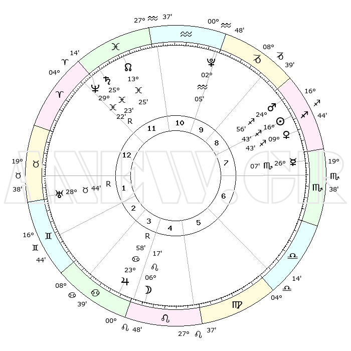 | | ΘΕΣΕΙΣ ΠΛΑΝΗΤΩΝ ΑΣΤΡΟΛΟΓΙΚΟΥ ΧΑΡΤΗ ΤΗΣ ΣΤΙΓΜΗΣ ΑΥΤΗΣ | | | | Πλανήτης | Ζώδιο | Μοίρες | Δεκαήμ. | Σε οίκο | Απόκλιση | | Ακμές των οίκων | | Ηλιος | Τοξότης | 16°40' | Δεύτερο | 8 | 22 S 46 | | 1ος | 26°18' | Κριός | | Σελήνη | Λέων | 05°38' | Πρώτο | 4 | 21 N 50 | | 2ος | 29°33' | Ταύρος | | Ερμής | Σκορπιός | 26°04' | Τρίτο | 7 | 17 S 03 | | 3ος | 23°30' | Δίδυμοι | | Αφροδίτη | Τοξότης | 09°40' | Πρώτο | 8 | 21 S 29 | | 4ος | 15°11' | Καρκίνος | | Αρης | Τοξότης | 24°54' | Τρίτο | 9 | 24 S 03 | | 5ος | 09°14' | Λέων | | Δίας | Καρκίνος | 23°58'R | Τρίτο | 4 | 21 N 29 | | 6ος | 11°13' | Παρθένος | | Κρόνος | Ιχθείς | 25°23' | Τρίτο | 12 | 03 S 59 | | 7ος | 26°18' | Ζυγός | | Ουρανός | Ταύρος | 28°45'R | Τρίτο | 1 | 19 N 41 | | 8ος | 29°33' | Σκορπιός | | Ποσειδώνας | Ιχθείς | 29°22'R | Τρίτο | 12 | 01 S 29 | | 9ος | 23°30' | Τοξότης | | Πλούτωνας | Υδροχόος | 02°05' | Πρώτο | 10 | 23 S 22 | | 10ος | 15°11' | Αιγόκερως | | Β. Δεσμός | Ιχθείς | 13°25' | Δεύτερο | 12 | 06 S 31 | | 11ος | 09°14' | Υδροχόος | | Ωροσκόπος | Κριός | 26°18' | Τρίτο | | | 12ος | 11°13' | Ιχθείς | | Μεσουράνημα | Αιγόκερως | 15°11' | Δεύτερο | | | |