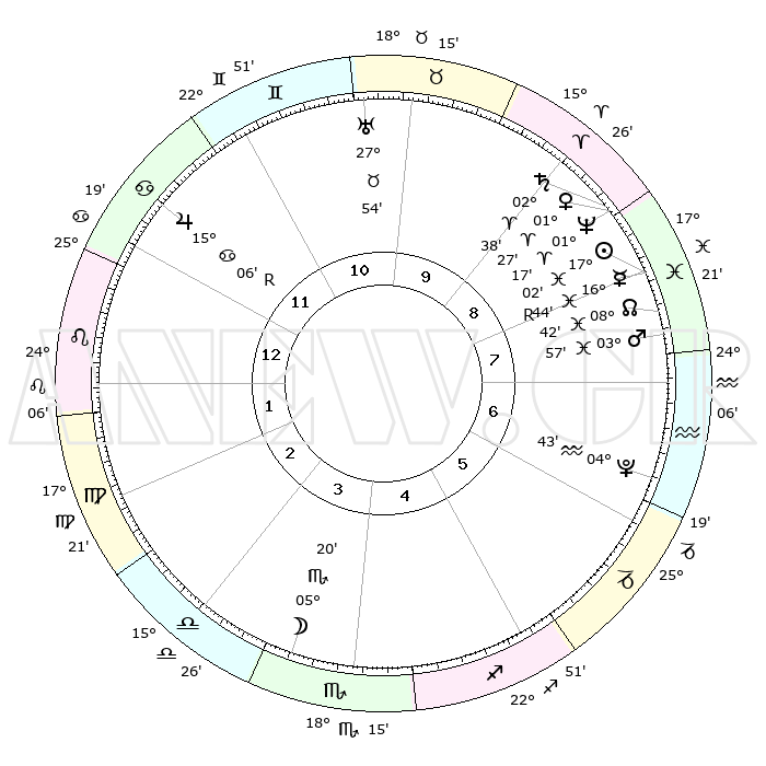| | ΘΕΣΕΙΣ ΠΛΑΝΗΤΩΝ ΑΣΤΡΟΛΟΓΙΚΟΥ ΧΑΡΤΗ ΤΗΣ ΣΤΙΓΜΗΣ ΑΥΤΗΣ | | | | Πλανήτης | Ζώδιο | Μοίρες | Δεκαήμ. | Σε οίκο | Απόκλιση | | Ακμές των οίκων | | Ηλιος | Ιχθείς | 16°58' | Δεύτερο | 8 | 05 S 09 | | 1ος | 07°37' | Λέων | | Σελήνη | Σκορπιός | 04°39' | Πρώτο | 4 | 17 S 10 | | 2ος | 29°14' | Λέων | | Ερμής | Ιχθείς | 16°48'R | Δεύτερο | 8 | 01 S 52 | | 3ος | 25°19' | Παρθένος | | Αφροδίτη | Κριός | 01°23' | Πρώτο | 9 | 00 S 35 | | 4ος | 27°11' | Ζυγός | | Αρης | Ιχθείς | 03°55' | Πρώτο | 8 | 11 S 05 | | 5ος | 02°55' | Τοξότης | | Δίας | Καρκίνος | 15°06'R | Δεύτερο | 12 | 22 N 56 | | 6ος | 07°25' | Αιγόκερως | | Κρόνος | Κριός | 02°38' | Πρώτο | 9 | 00 S 54 | | 7ος | 07°37' | Υδροχόος | | Ουρανός | Ταύρος | 27°53' | Τρίτο | 10 | 19 N 31 | | 8ος | 29°14' | Υδροχόος | | Ποσειδώνας | Κριός | 01°17' | Πρώτο | 9 | 00 S 41 | | 9ος | 25°19' | Ιχθείς | | Πλούτωνας | Υδροχόος | 04°42' | Πρώτο | 6 | 22 S 51 | | 10ος | 27°11' | Κριός | | Β. Δεσμός | Ιχθείς | 08°42' | Πρώτο | 8 | 08 S 18 | | 11ος | 02°55' | Δίδυμοι | | Ωροσκόπος | Λέων | 07°37' | Πρώτο | | | 12ος | 07°25' | Καρκίνος | | Μεσουράνημα | Κριός | 27°11' | Τρίτο | | | |